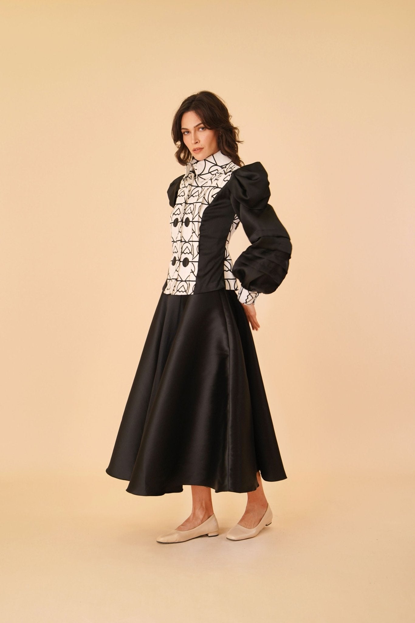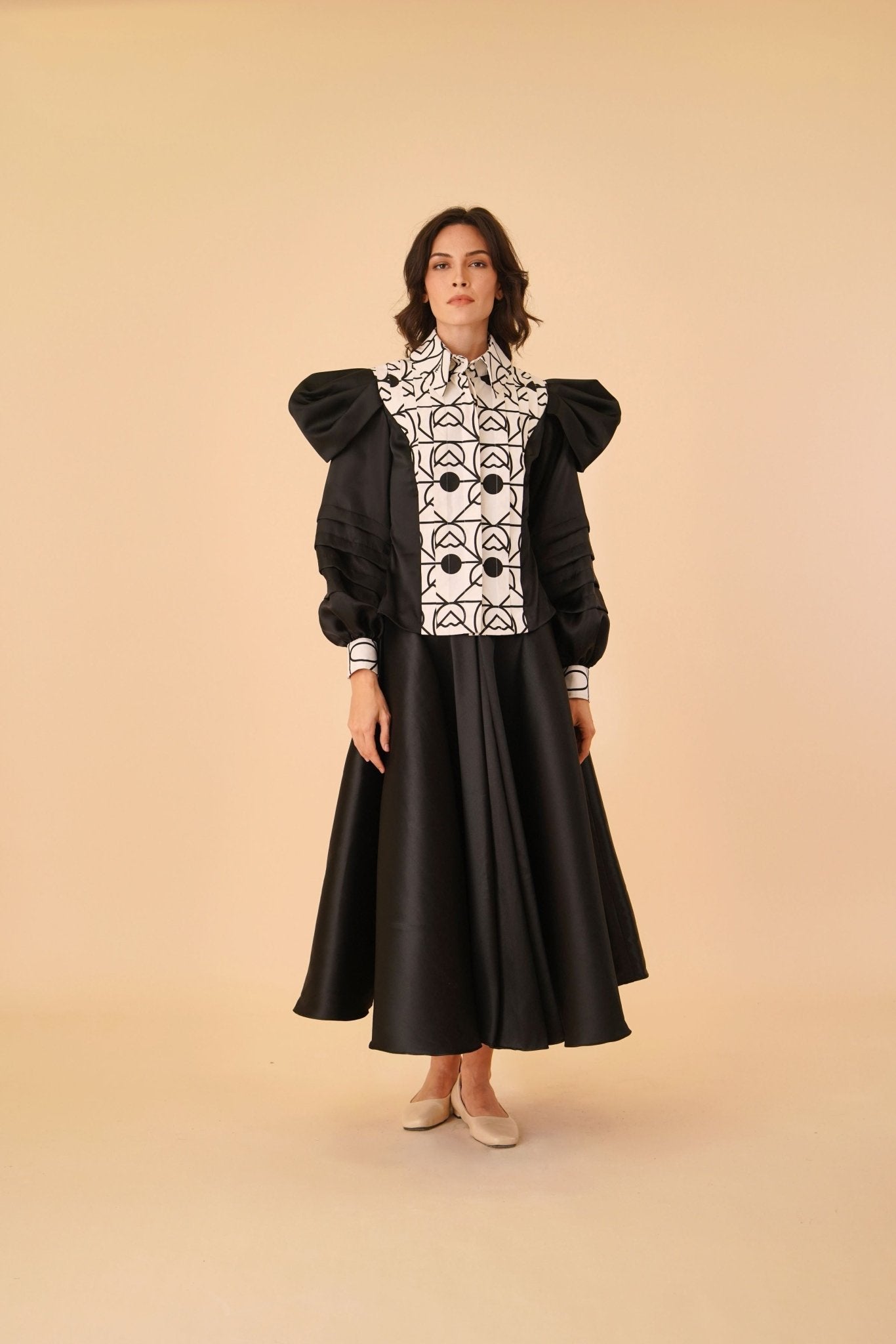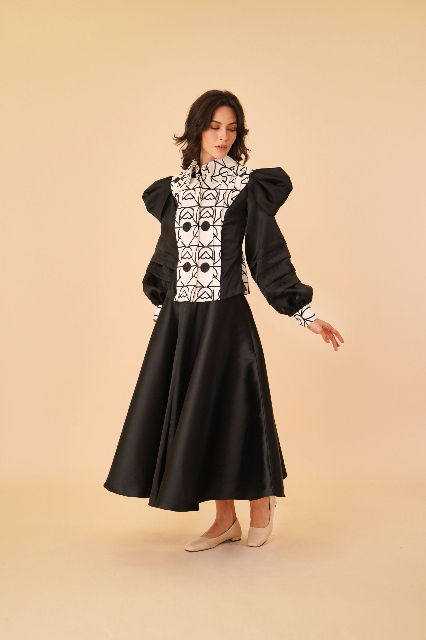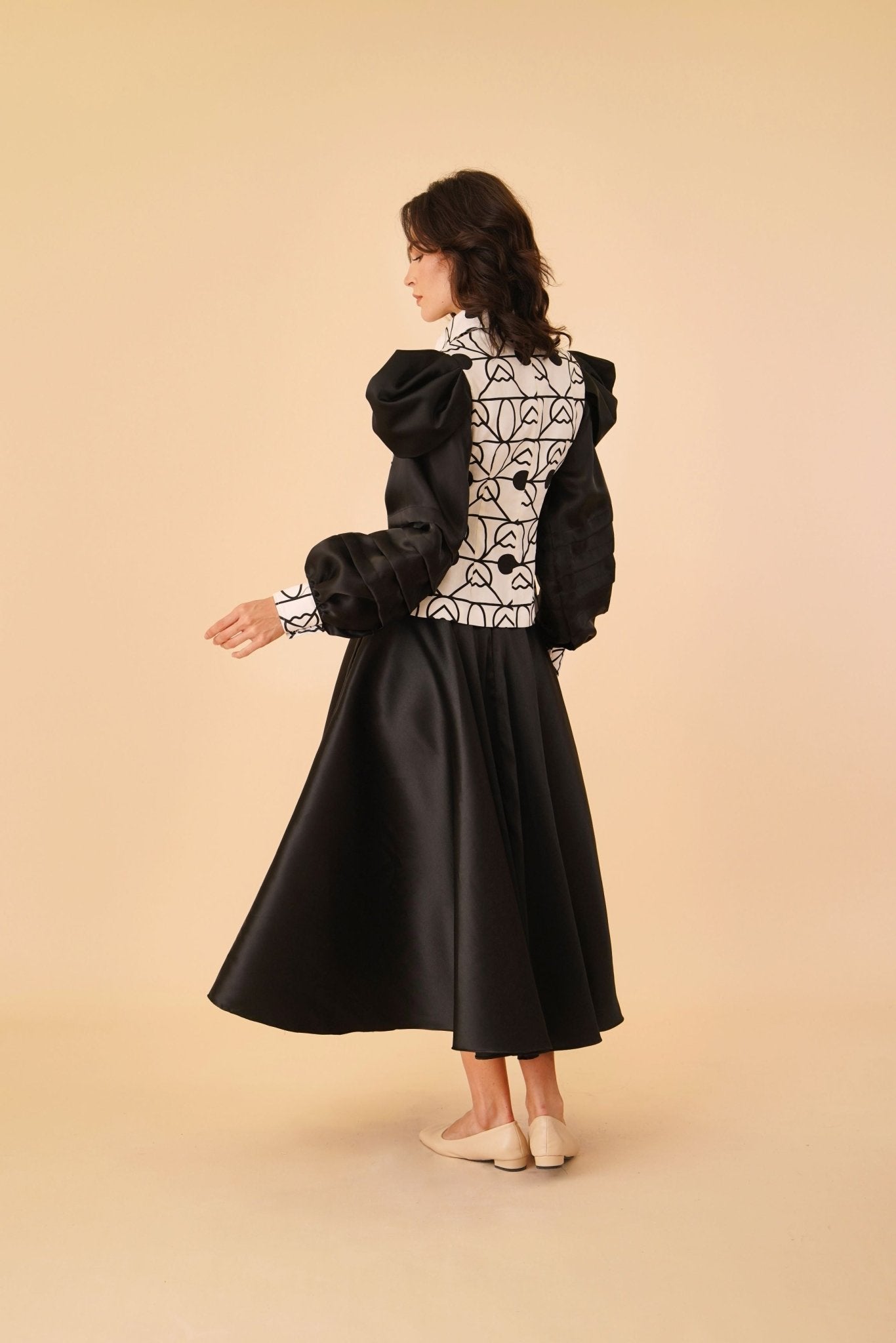 - Black satin fabric with long puffy sleeves