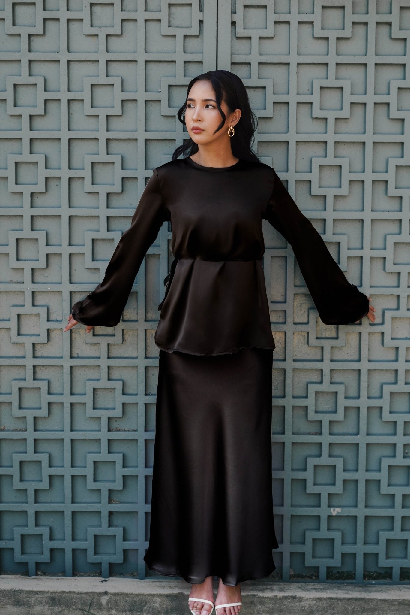 The City Breeze Pt.2 Women Long Sleeves Satin Blouse With Waist String Black