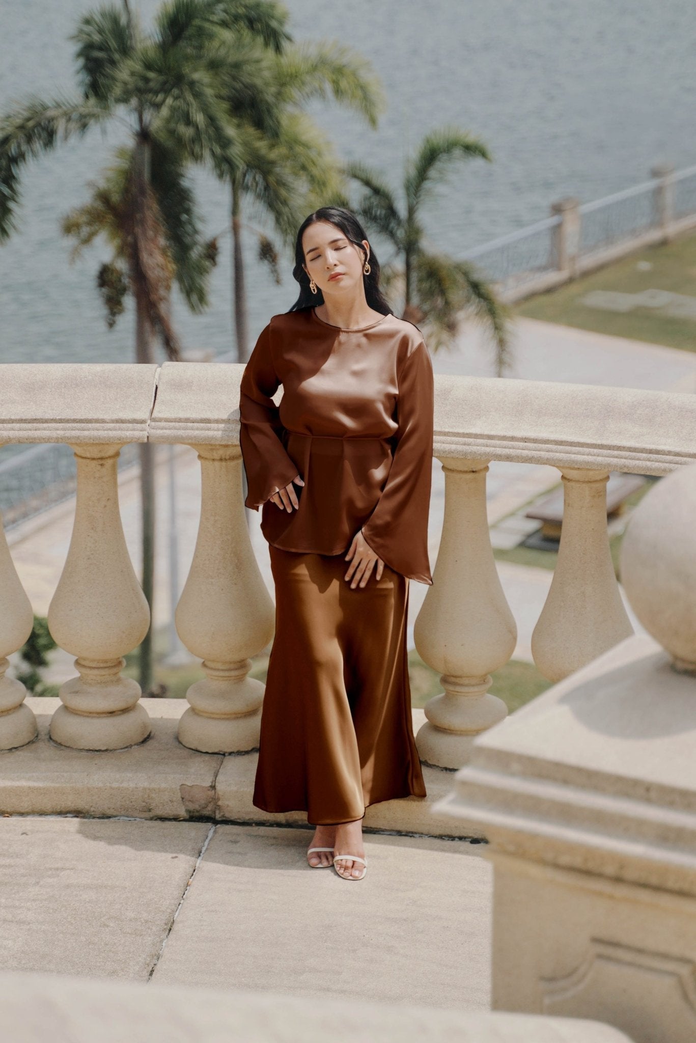 The City Breeze Pt.2 Women Long Sleeves Satin Blouse With Waist String Dark Chocolate