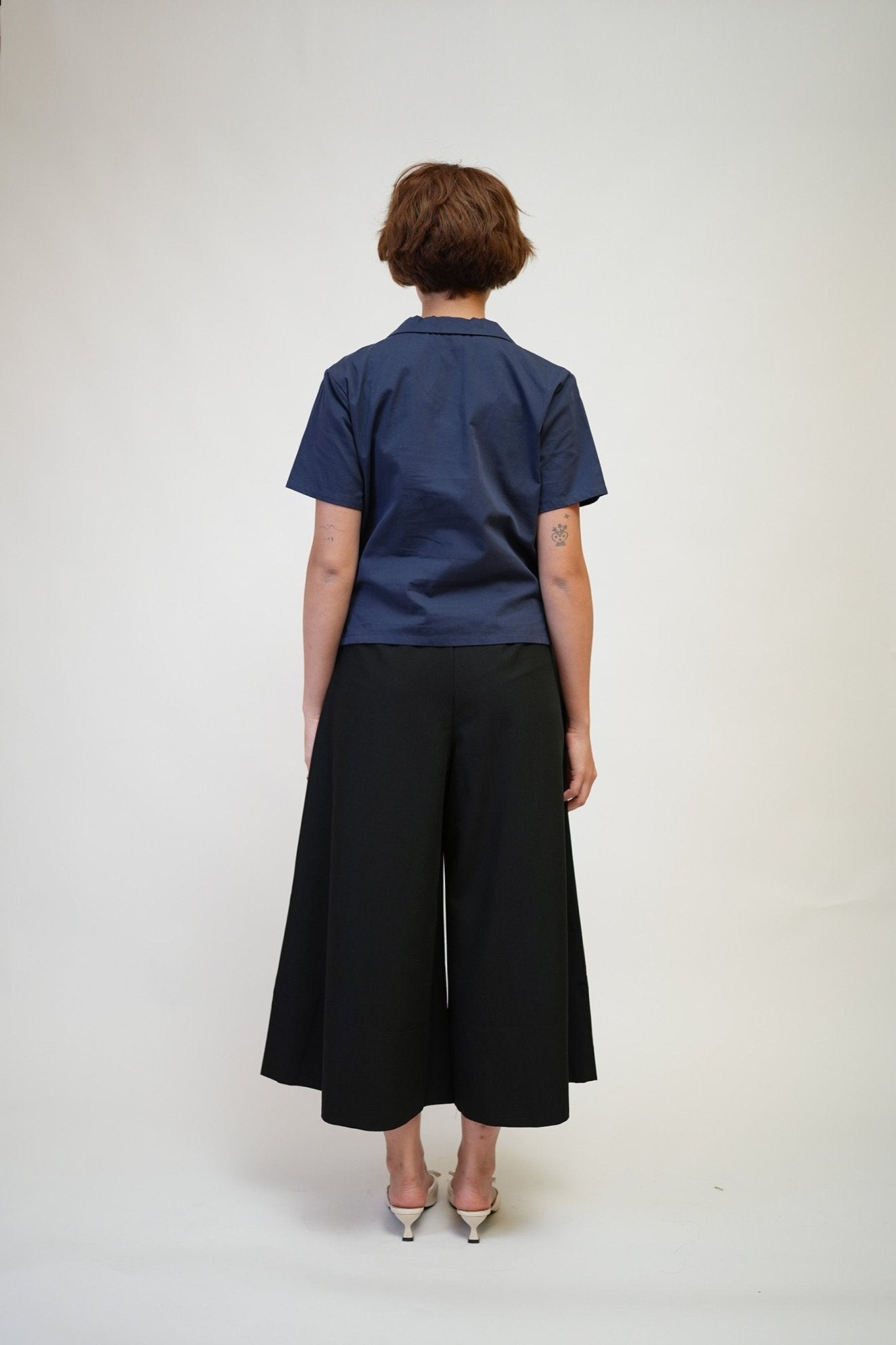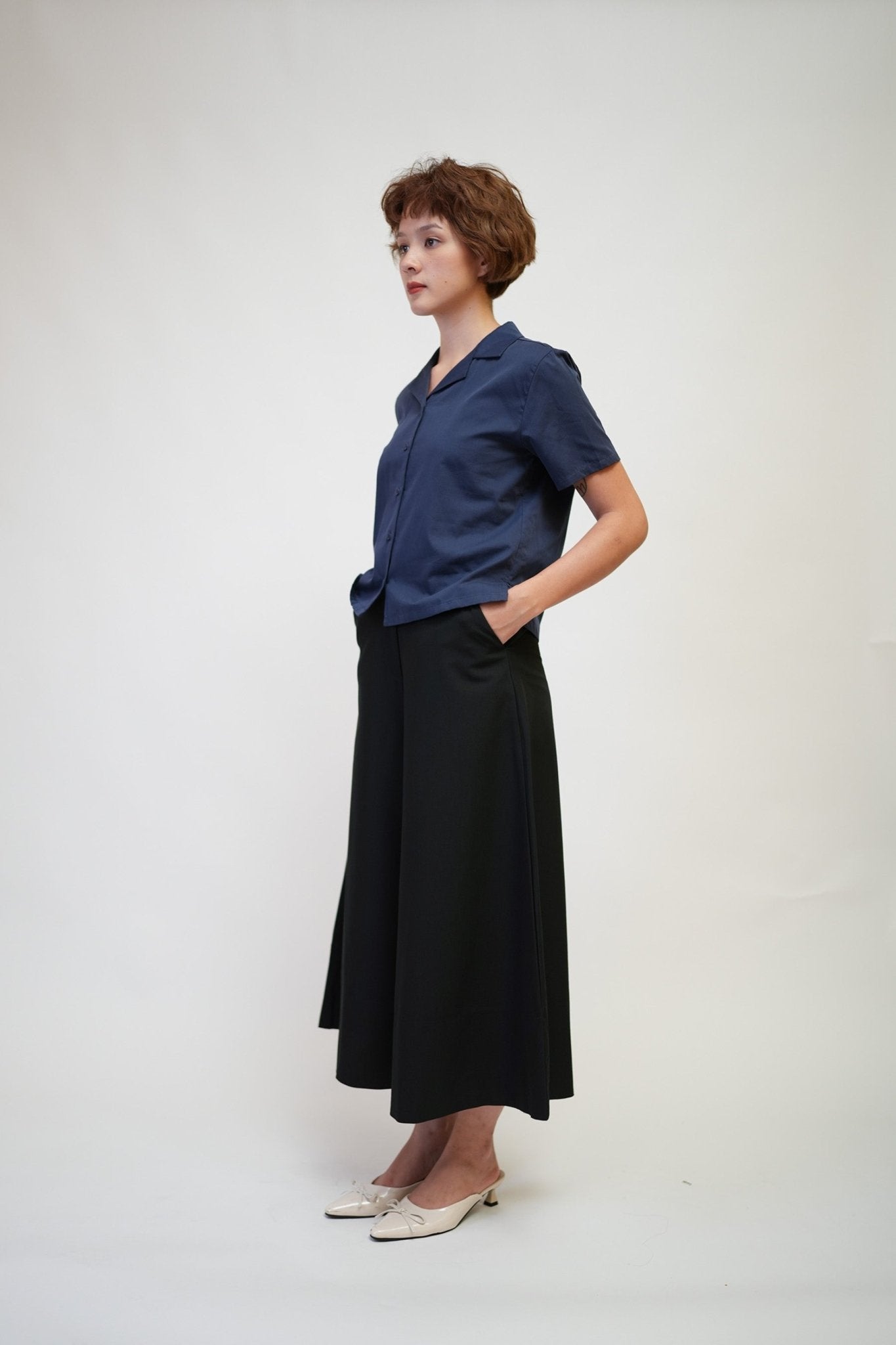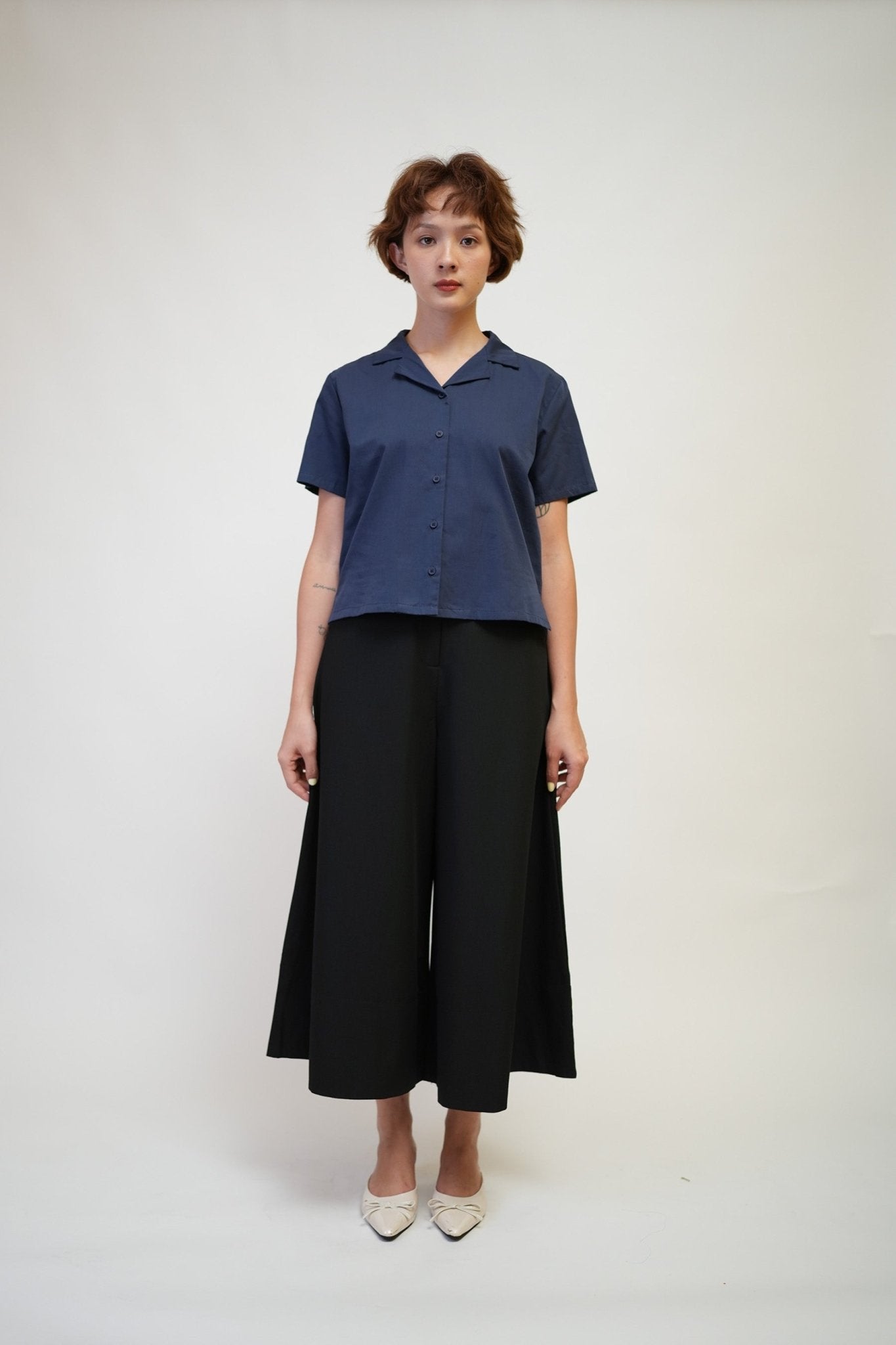 Casual top with a stylish sleek open collar and short sleeves.
