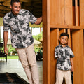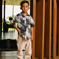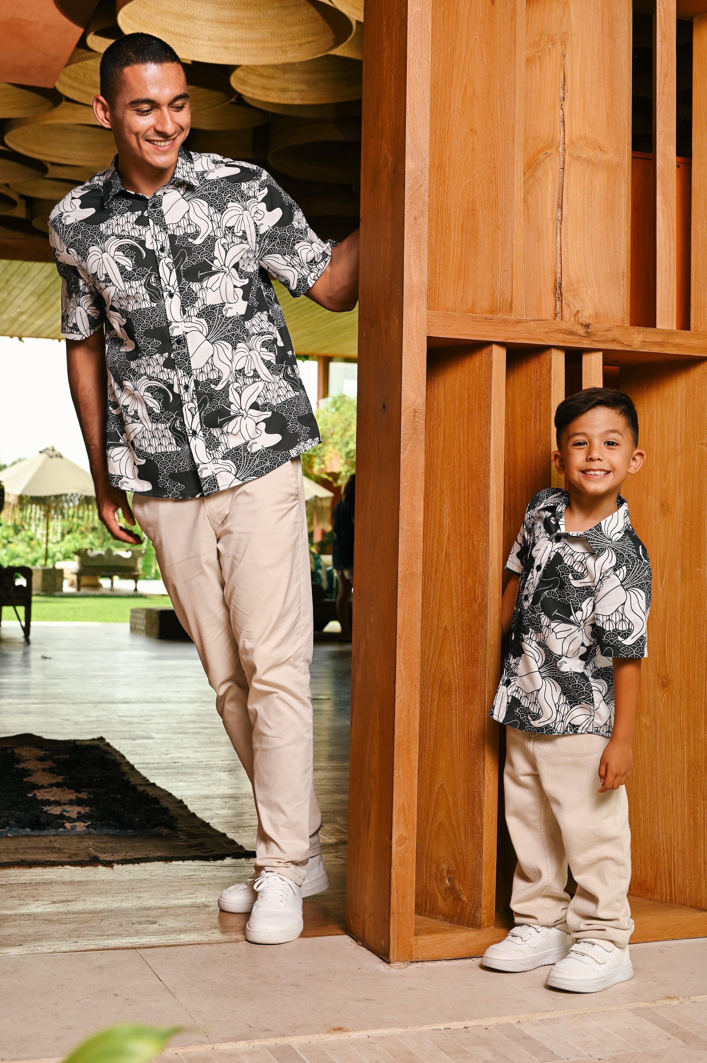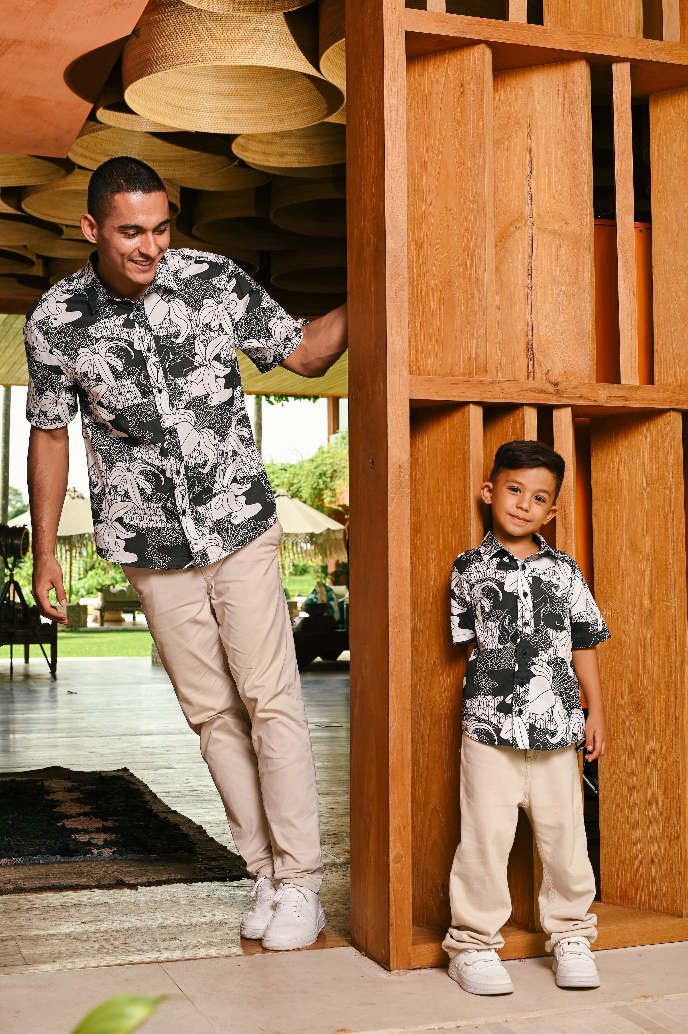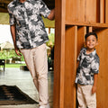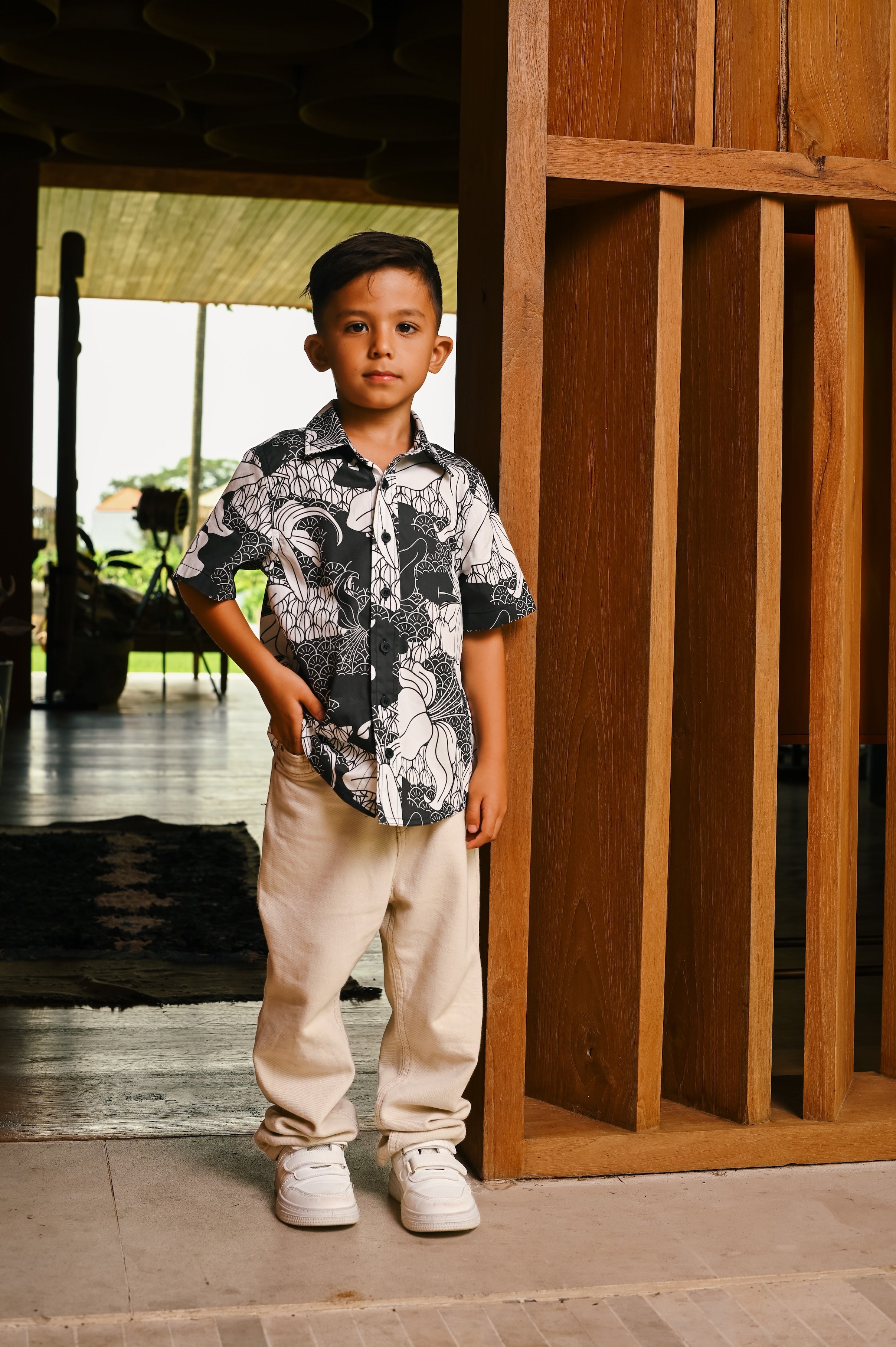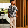 The Embun Collection Boy Holiday Shirt in Black & White Banjaran Print
