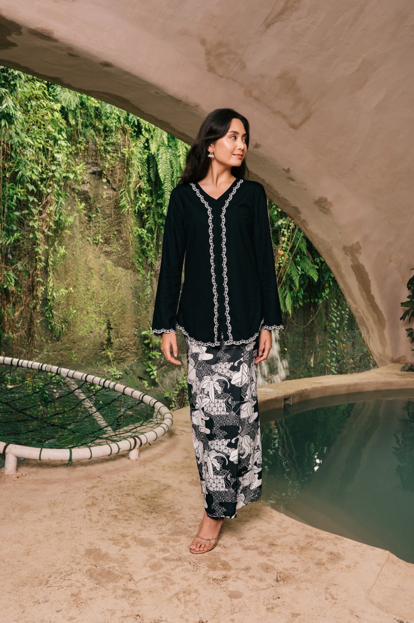 The Embun Collection Women Classic Skirt in Black & White Banjaran Print