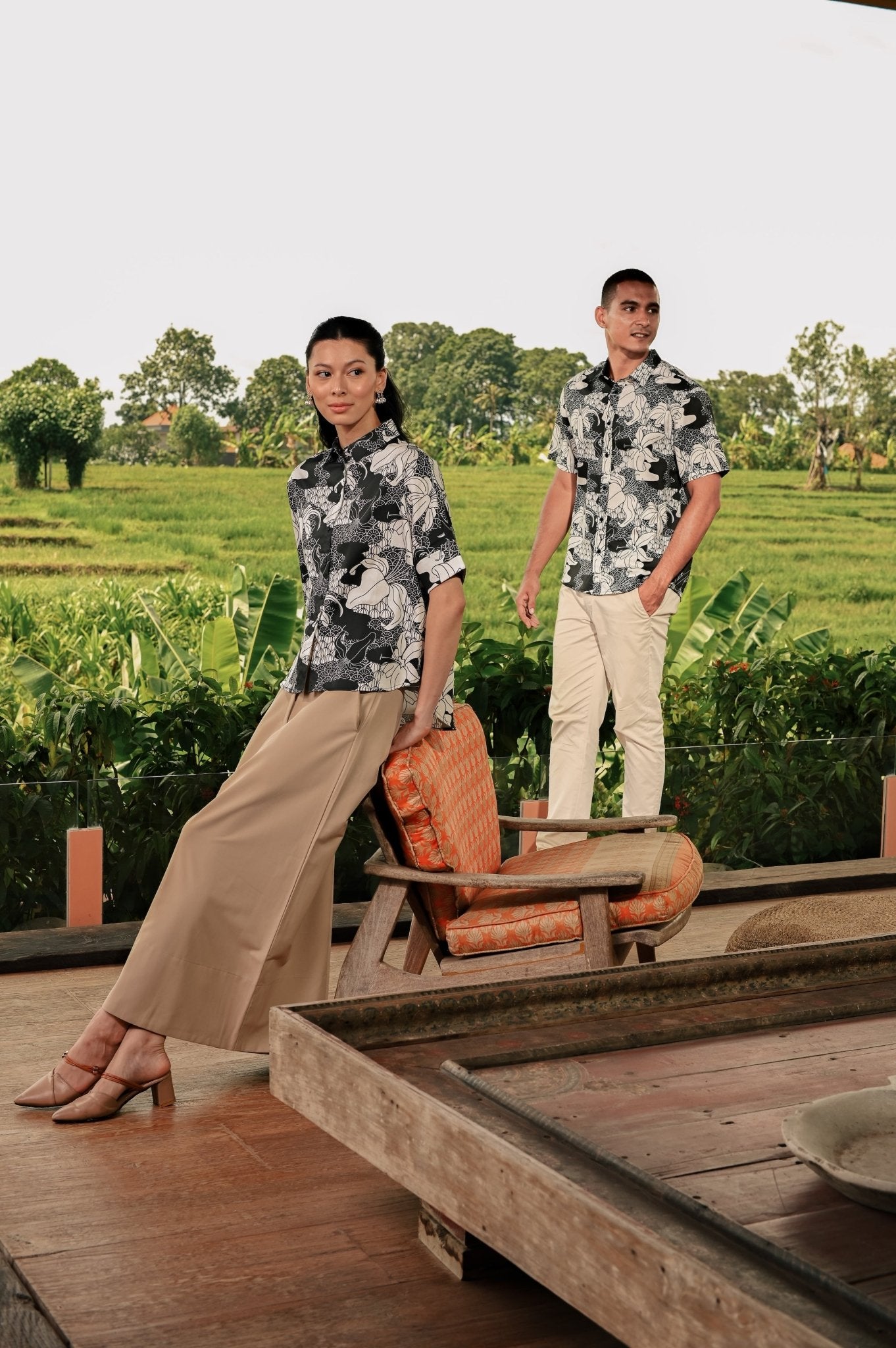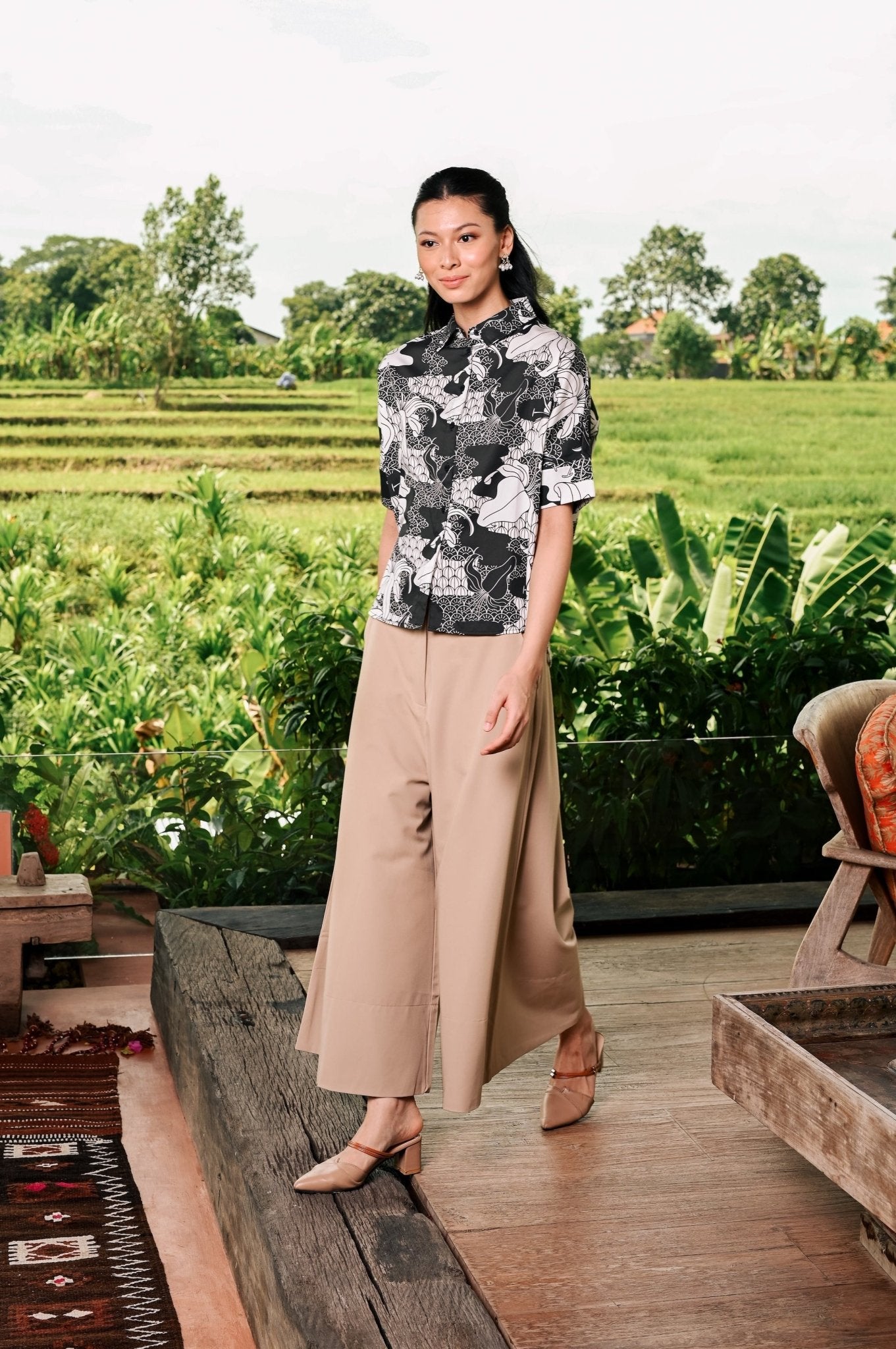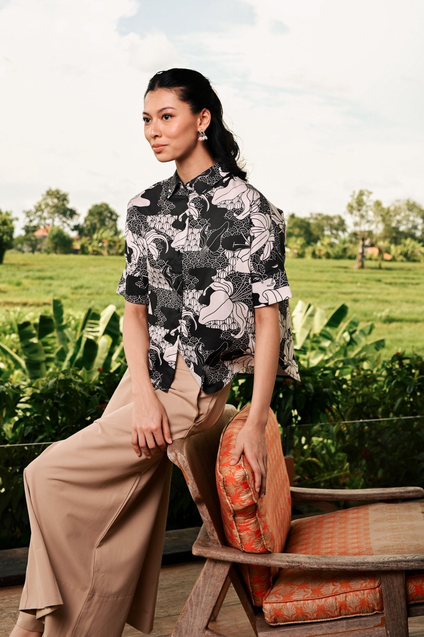 The Embun Collection Women Short Sleeves Loose Fit Blouse in Black & White Banjaran Print