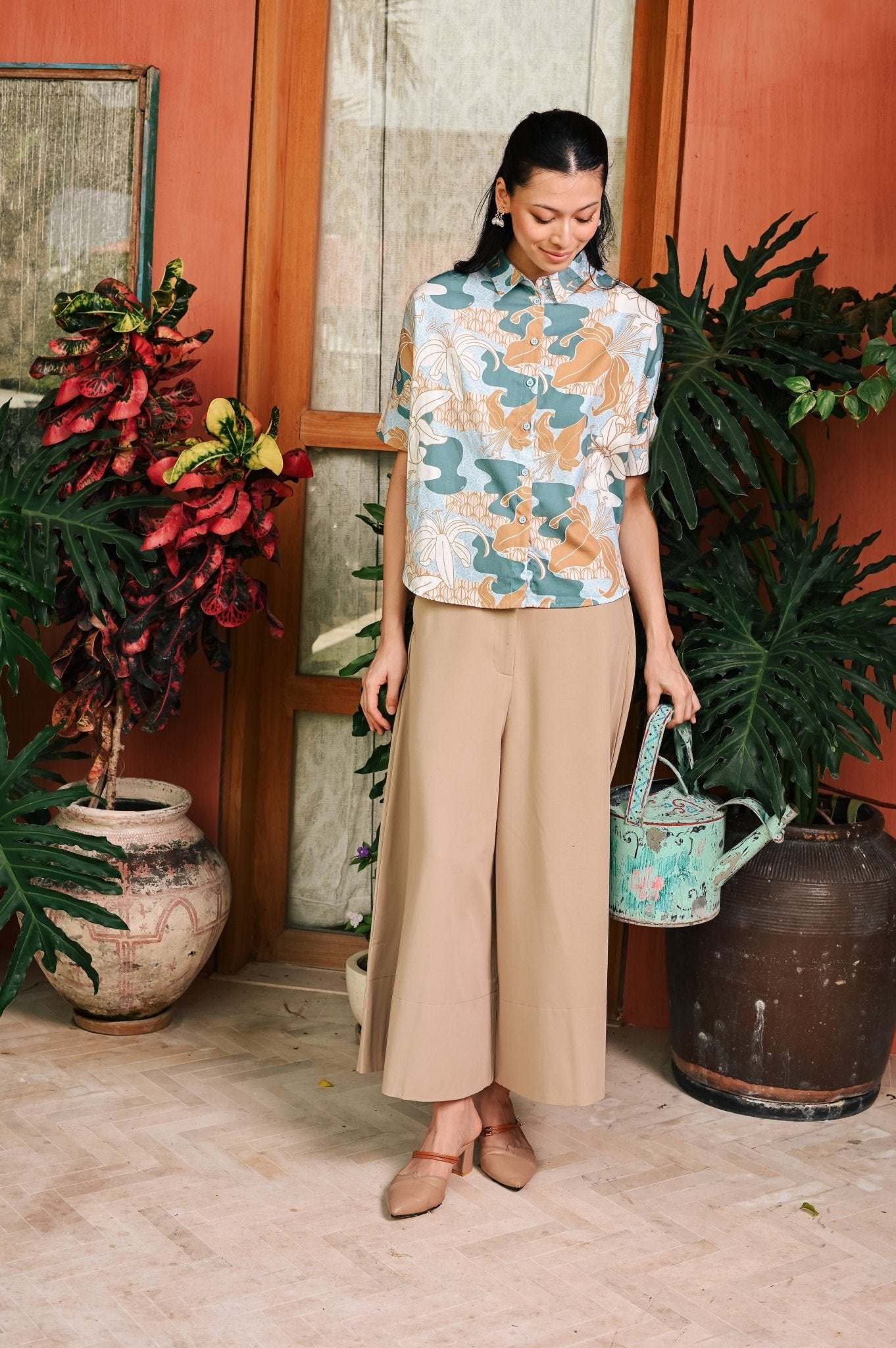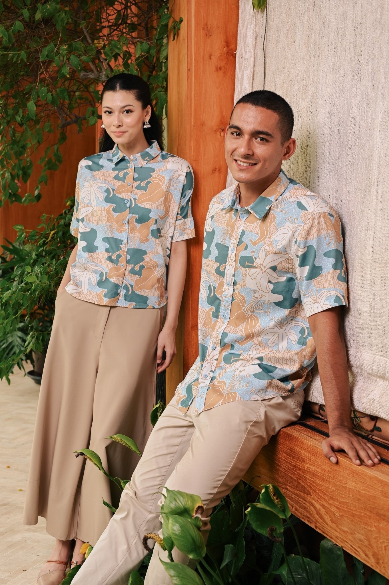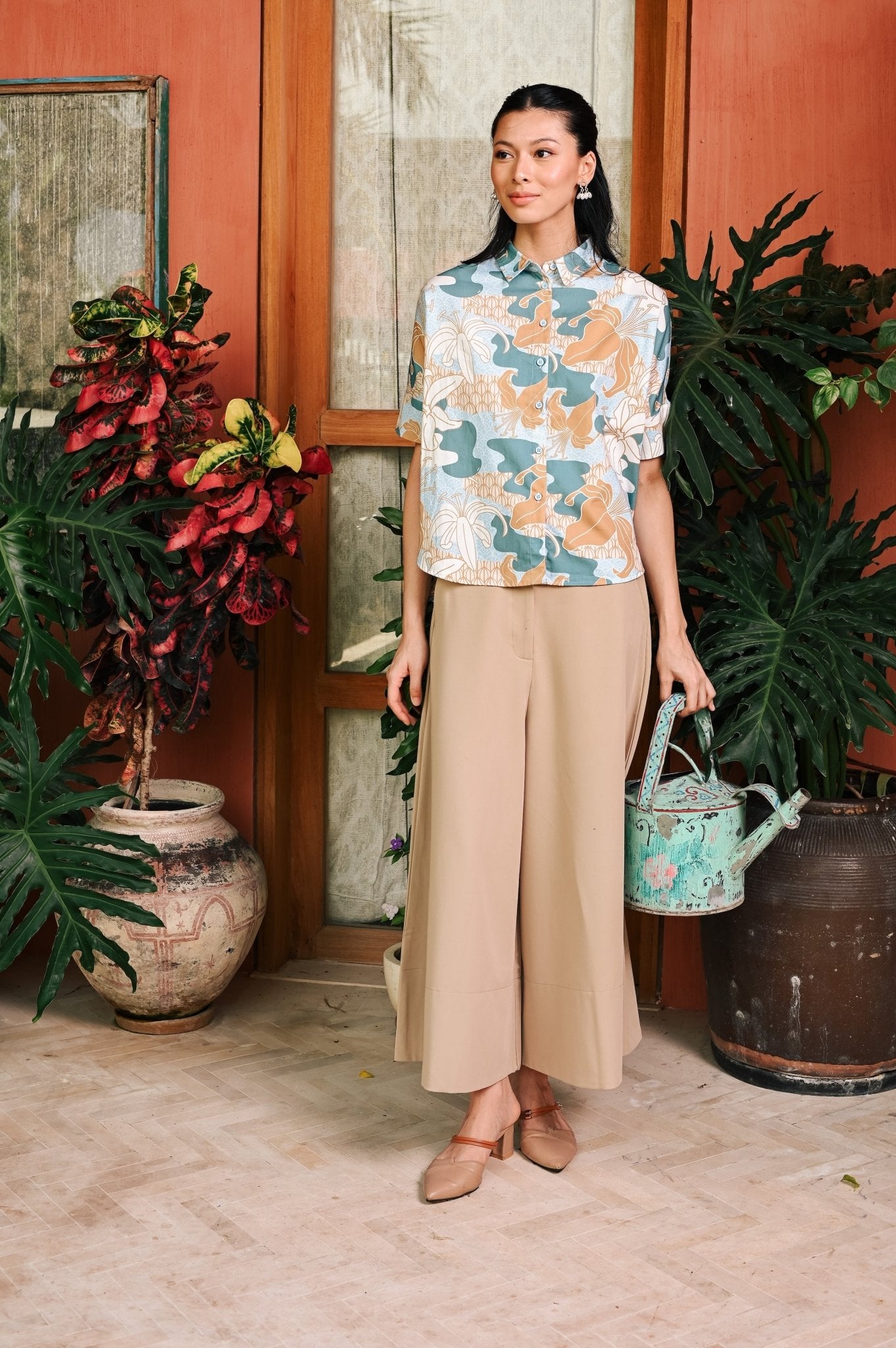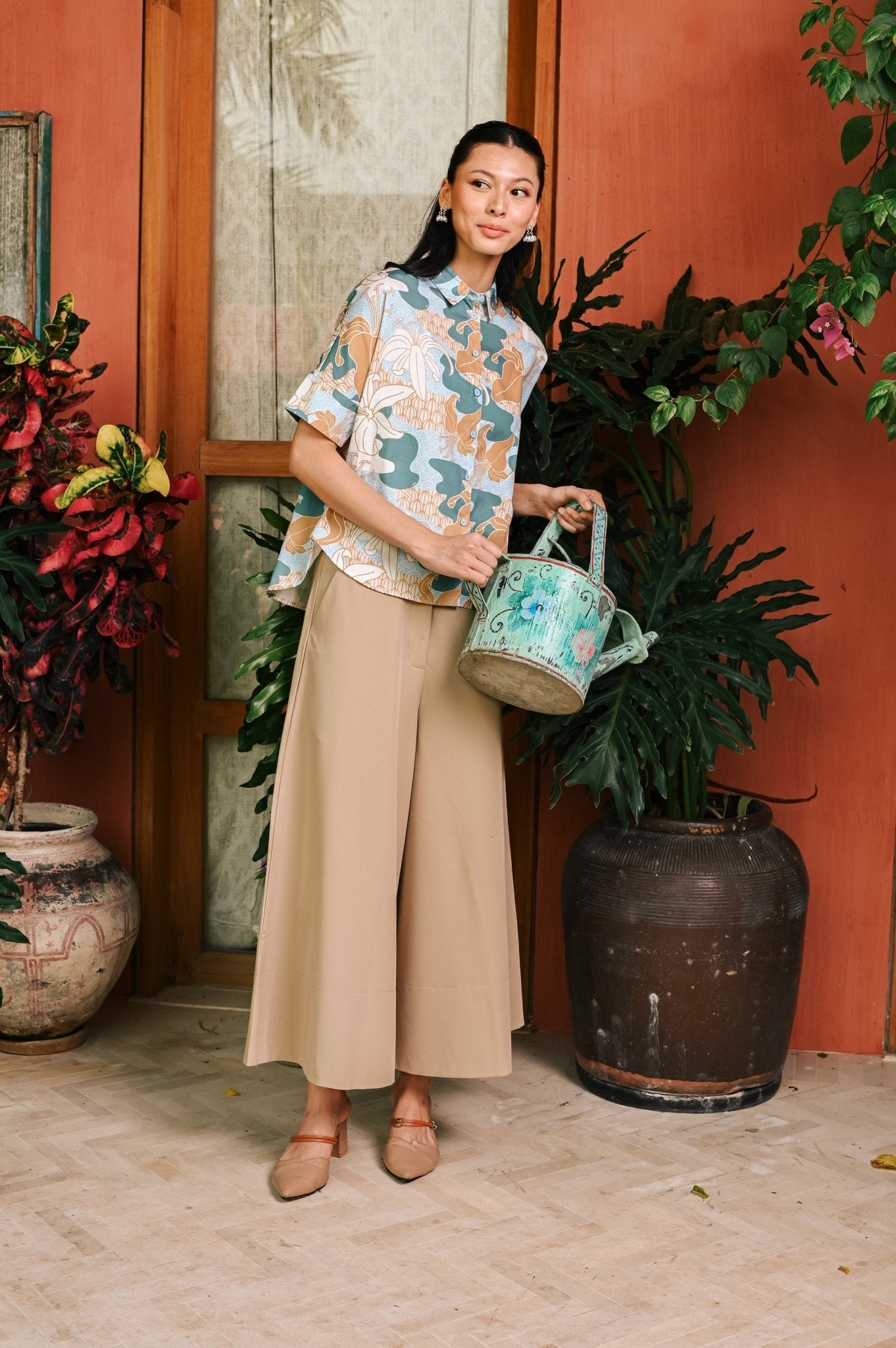 The Embun Collection Women Short Sleeves Loose Fit Blouse in Blue & Olive Banjaran Print