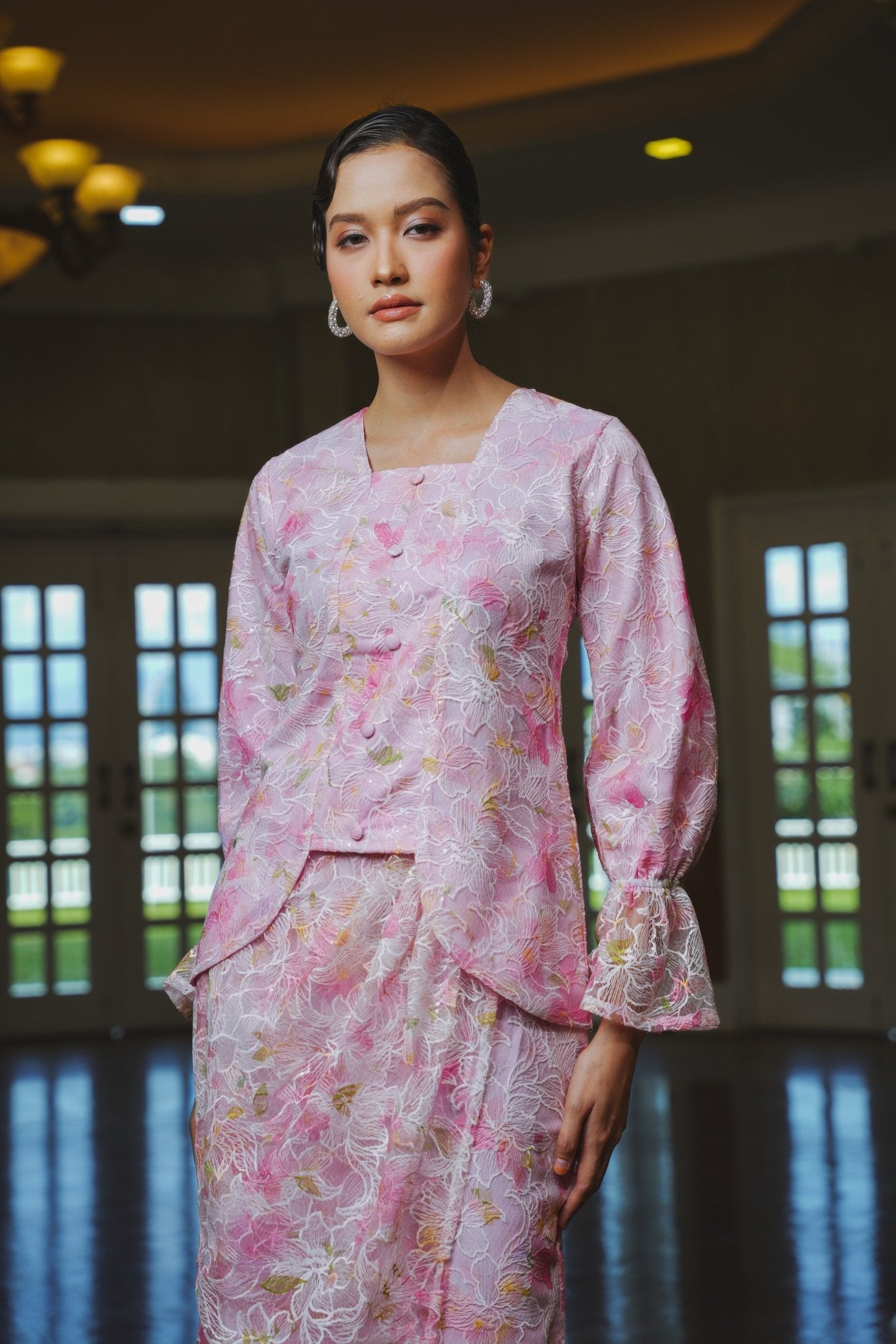 - Valencia Kebaya Set inspired by classic kebaya designs with a modern blend, paired with a matching wrap-style skirt for a soft, romantic silhouette.