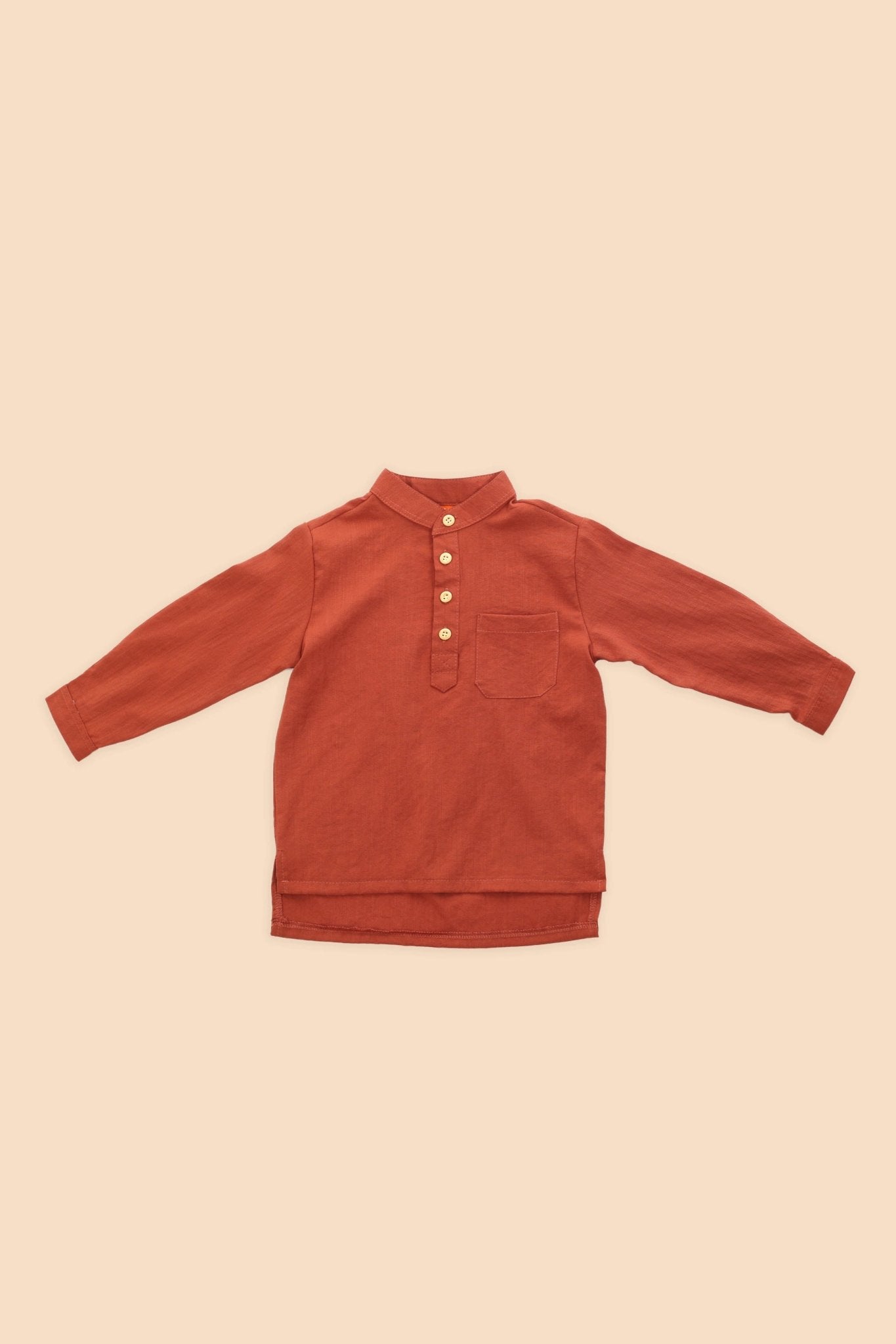 - Mandarin collar with wooden buttons