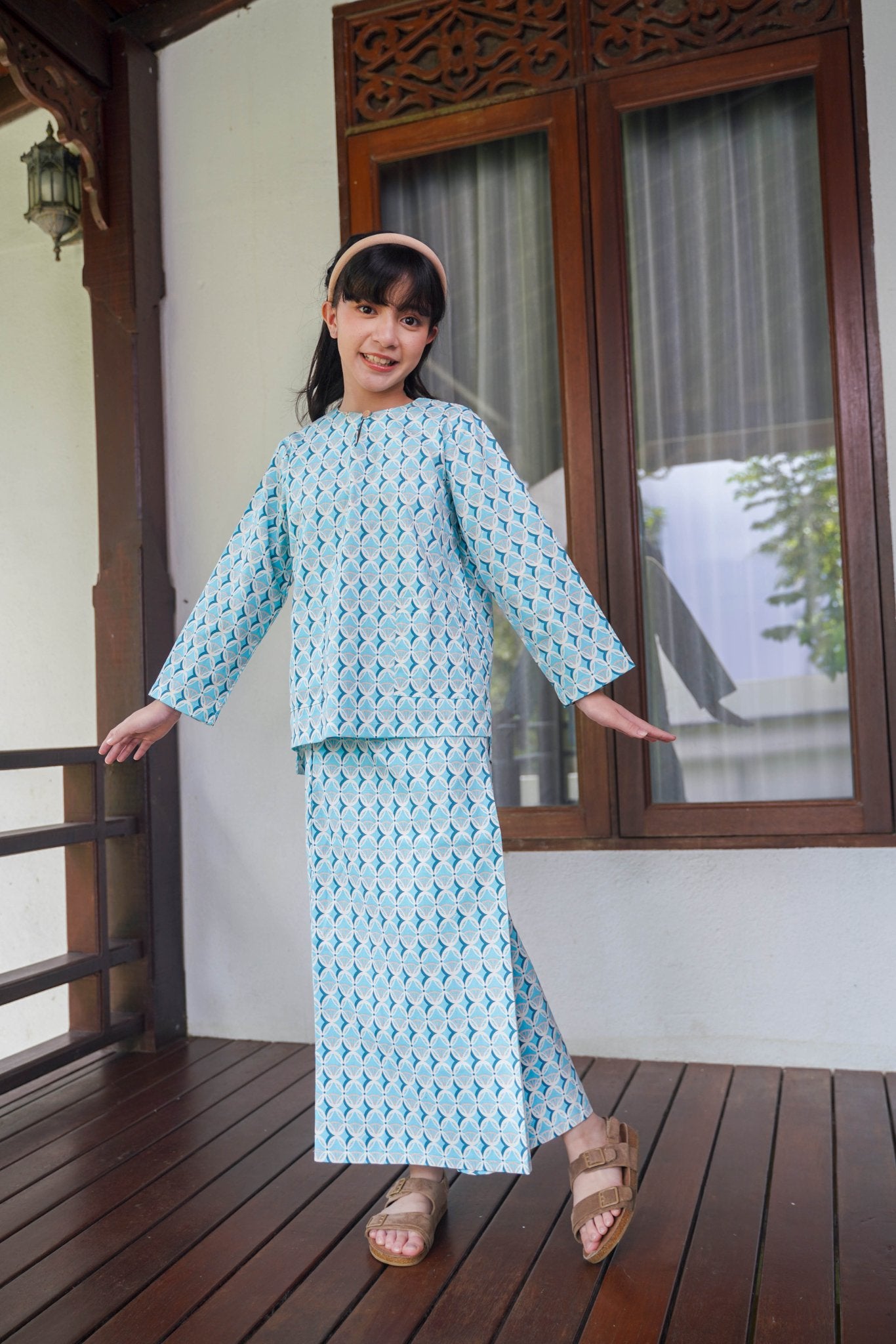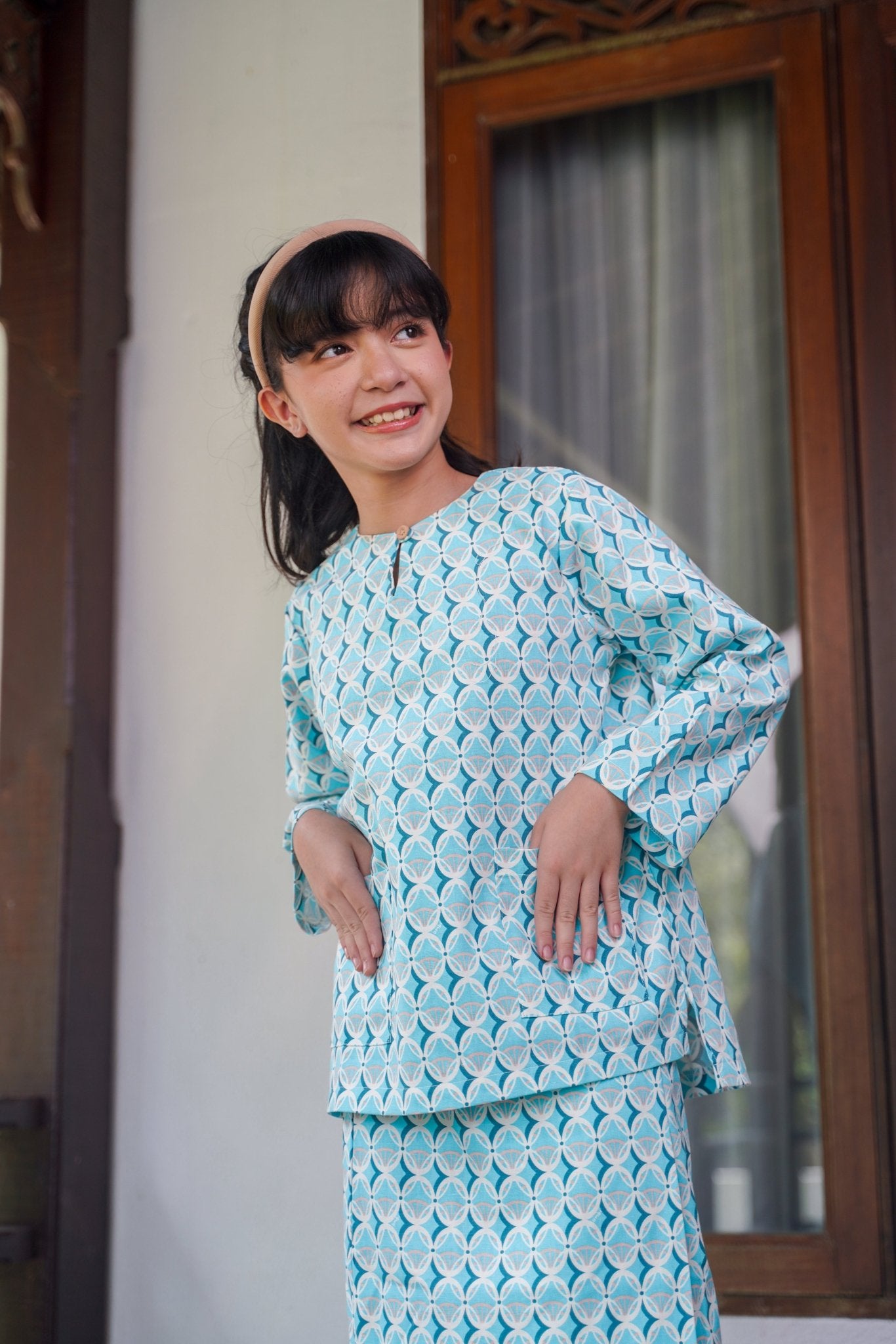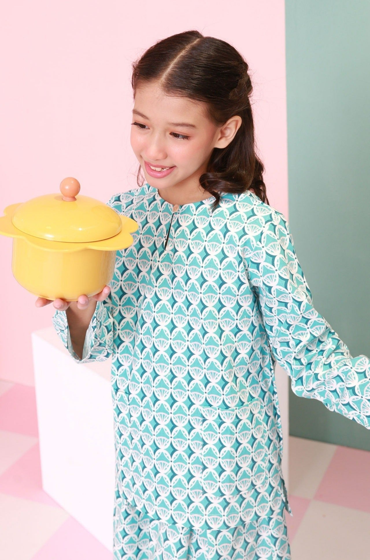 The Nikmat Collection Girl Kurung Top Mint Drops Print