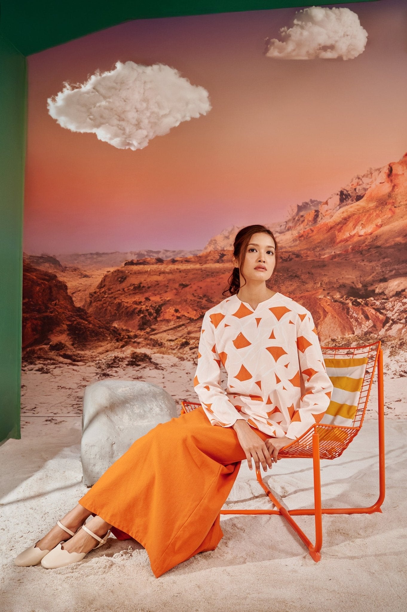 The Oasis Women Kurung Top with Scallop Embroidery Desert Print