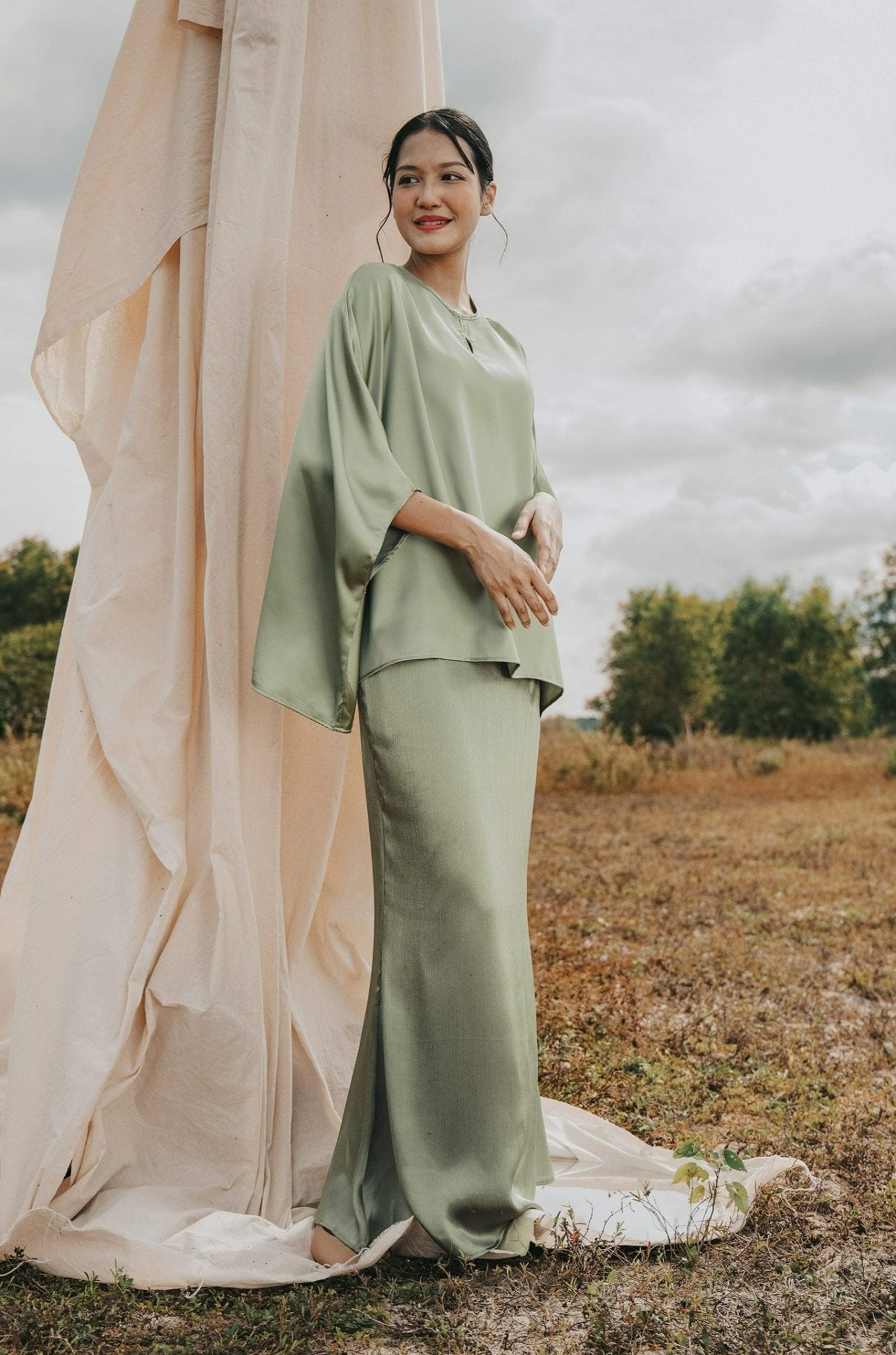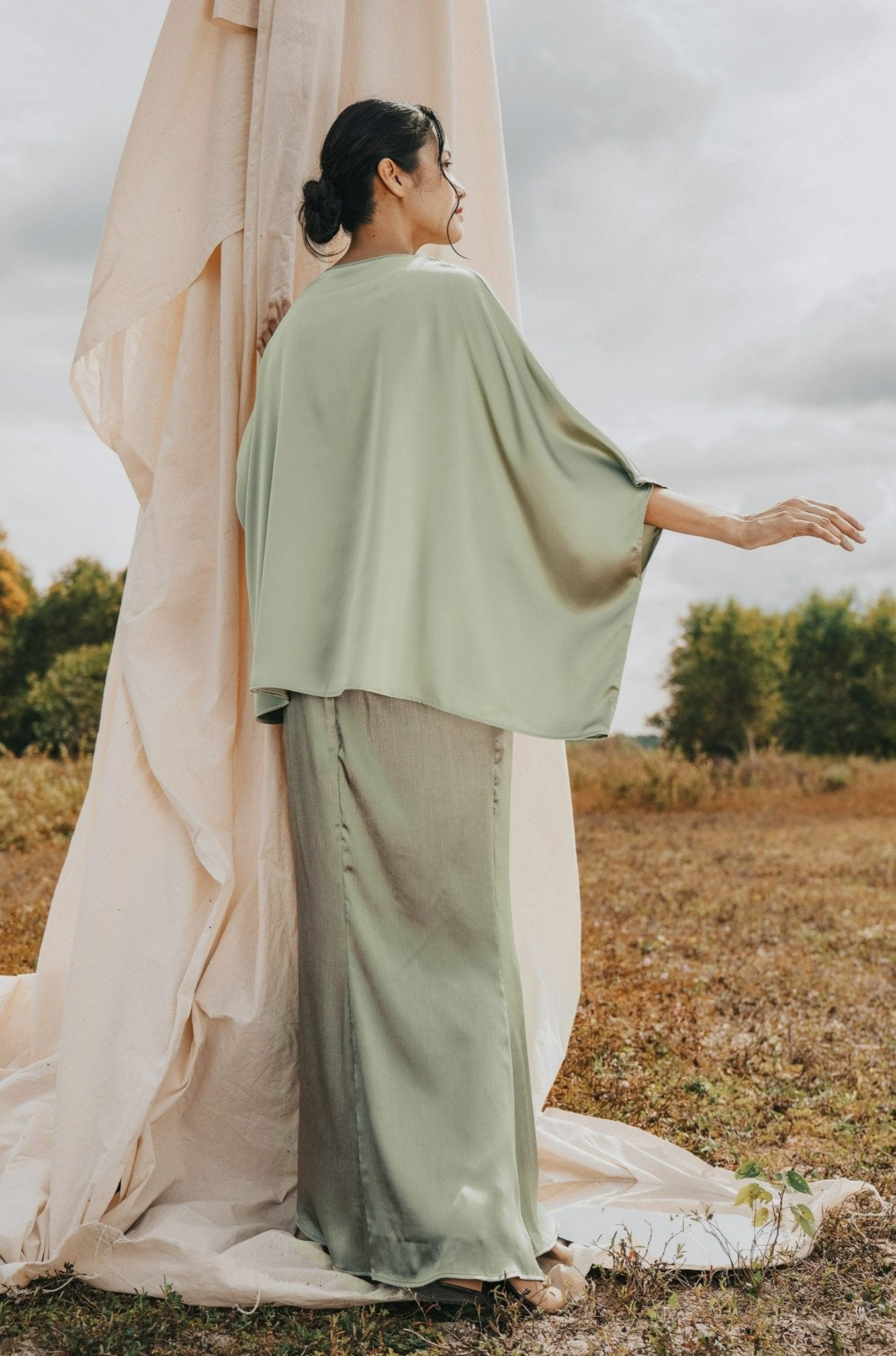 The Shawwal Collection Women Kaftan Blouse Matcha Green Satin