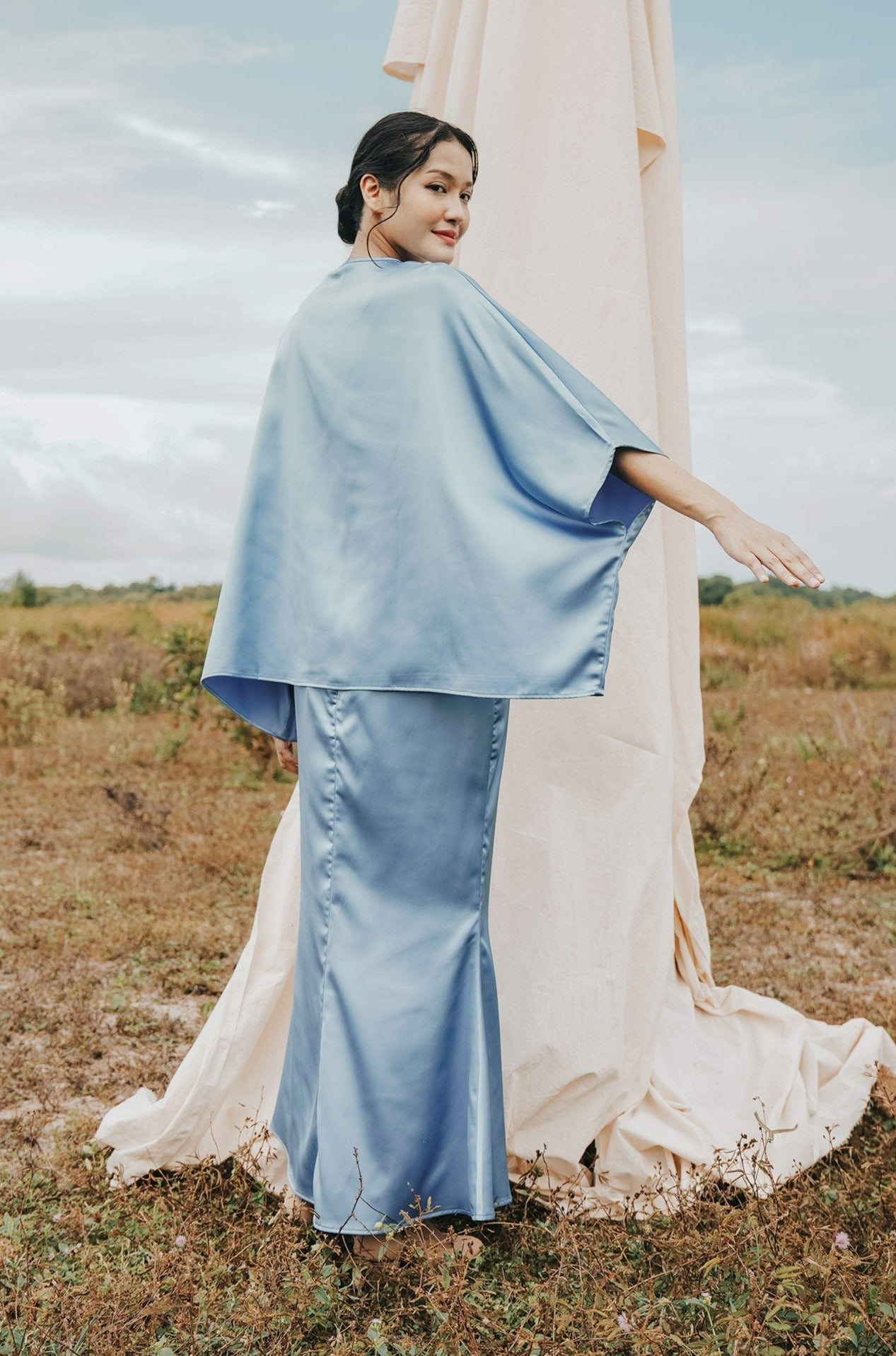 The Shawwal Collection Women Kaftan Blouse Pigeon Blue Satin