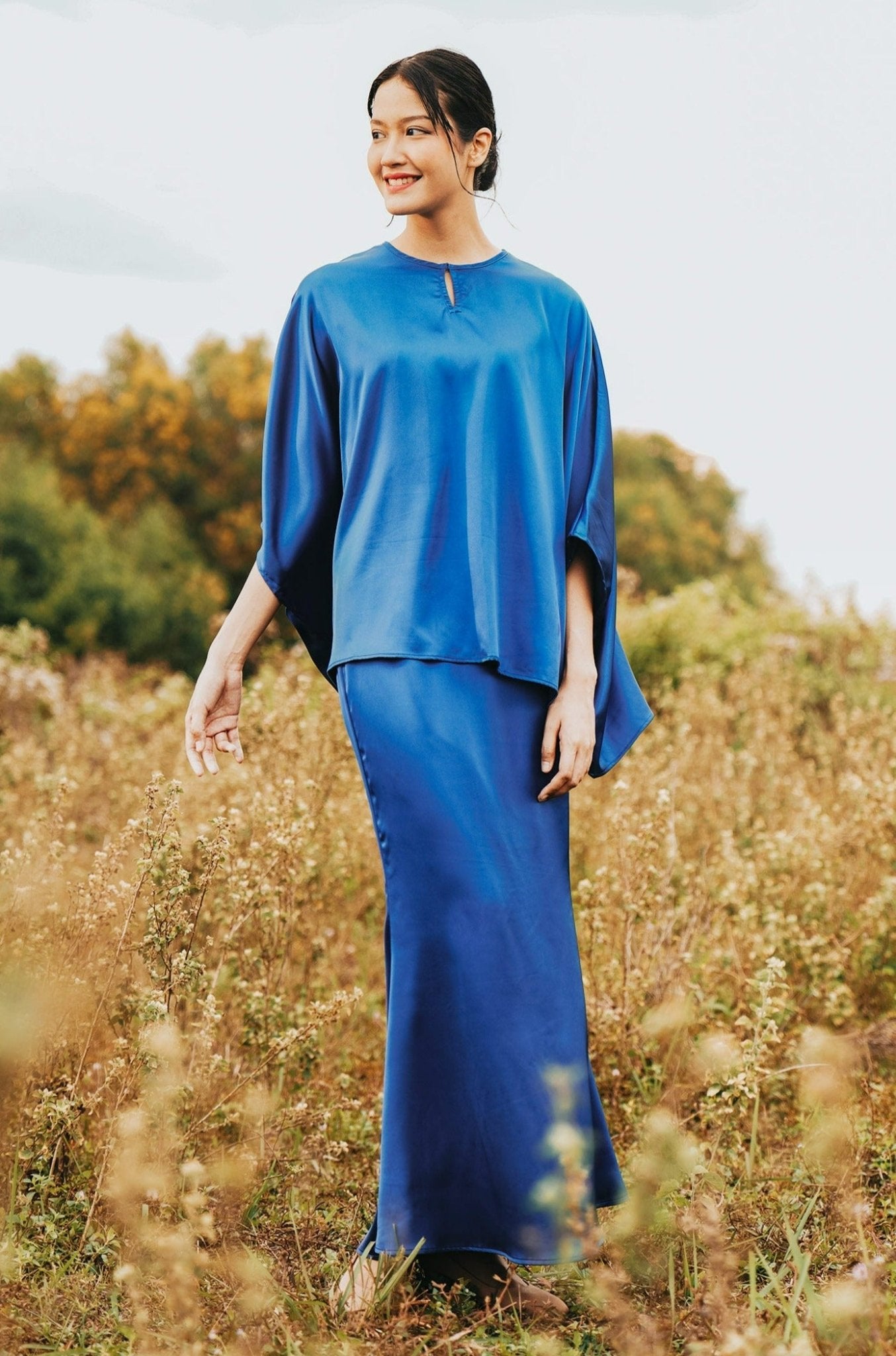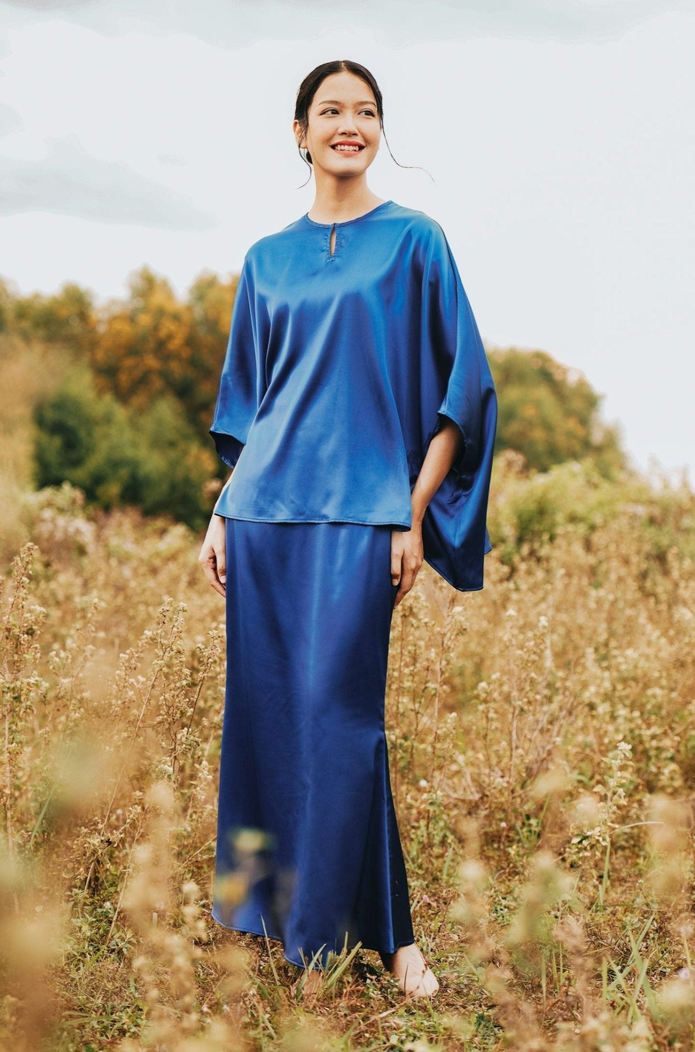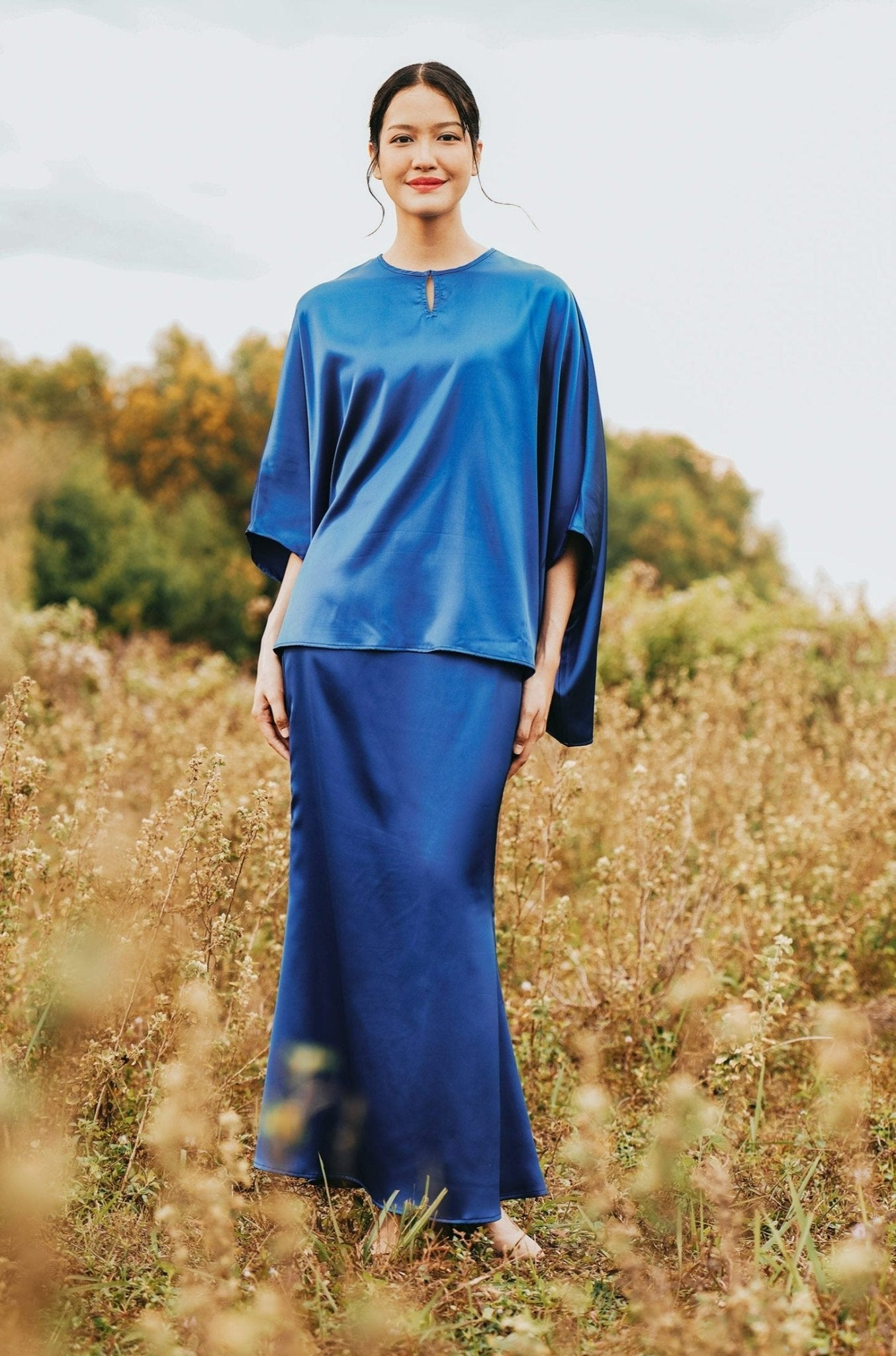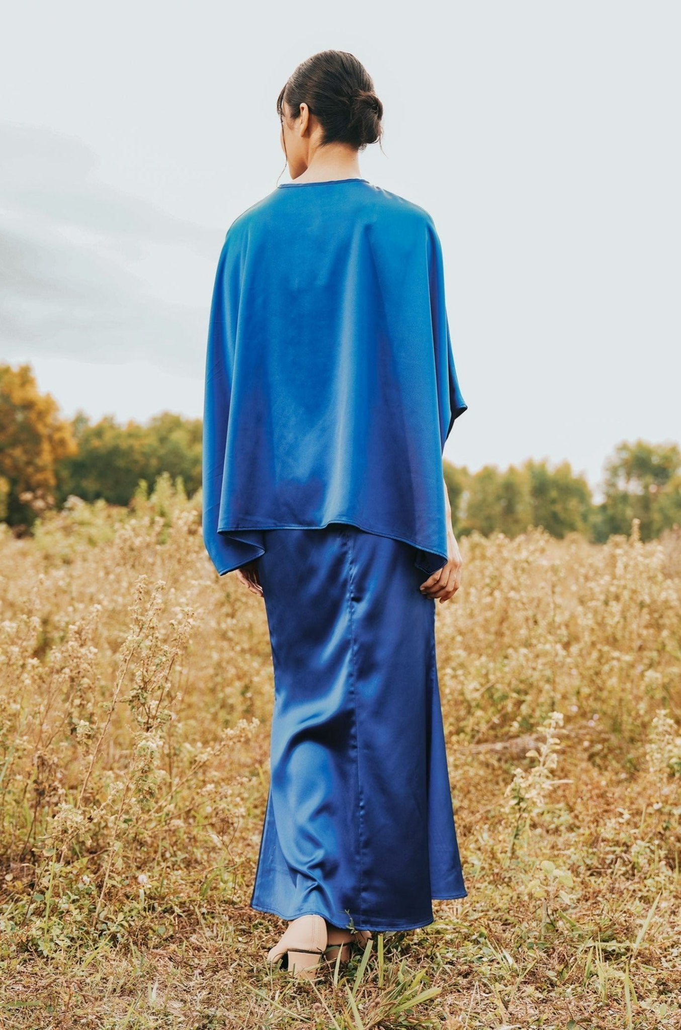 The Shawwal Collection Women Kaftan Blouse Royal Blue Satin