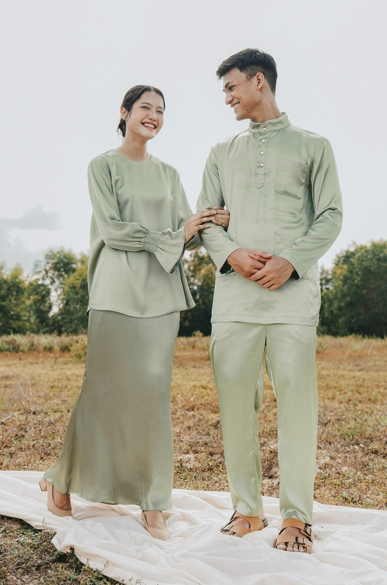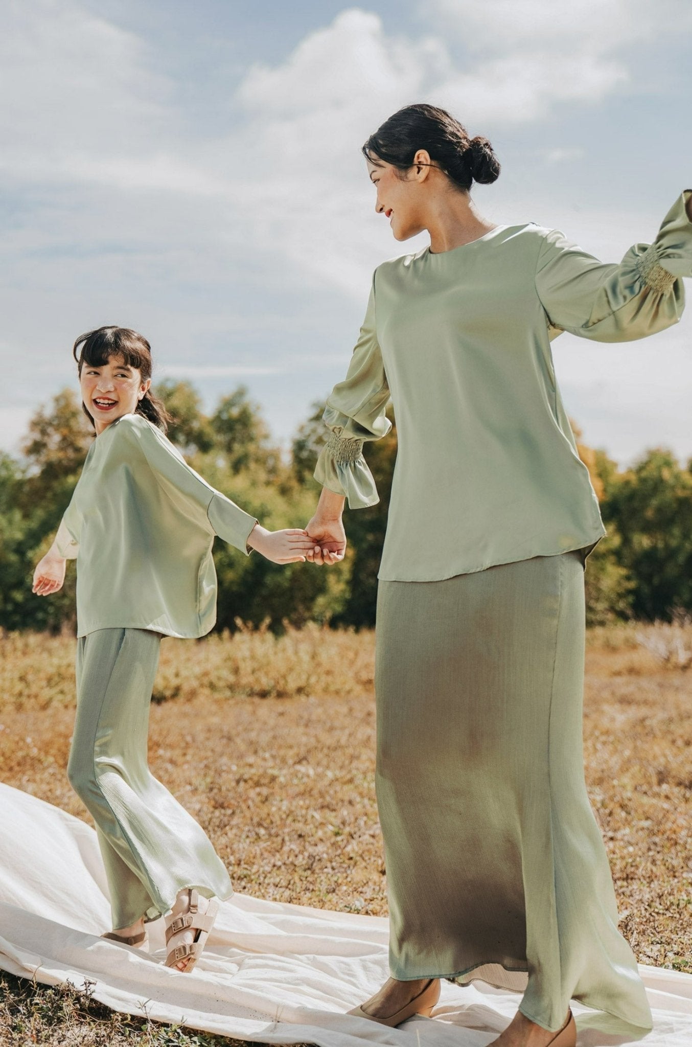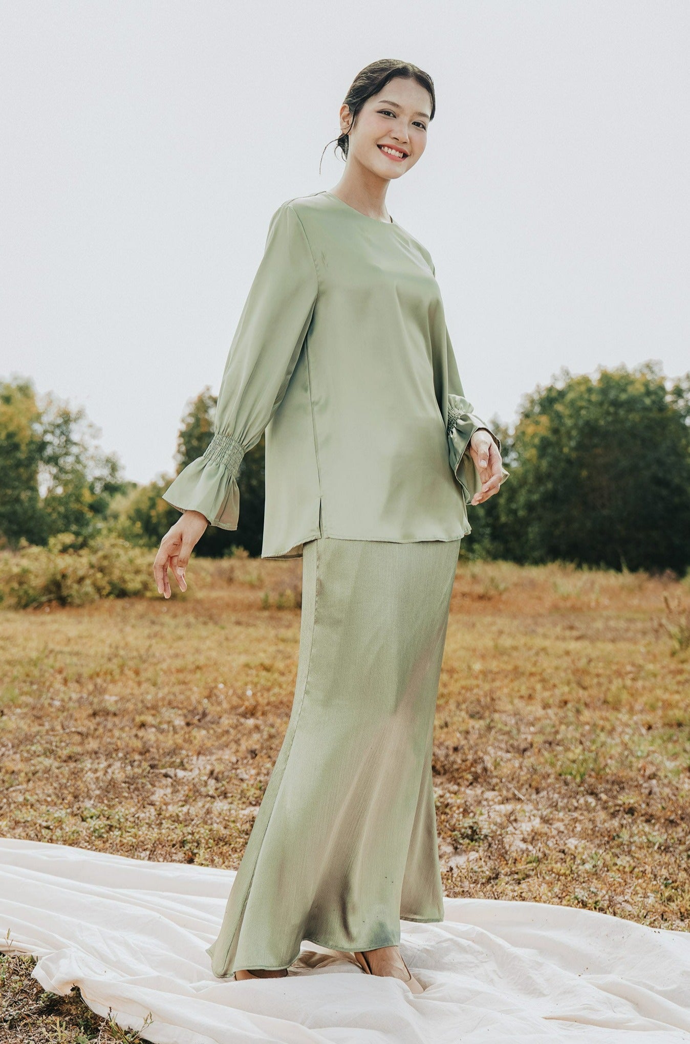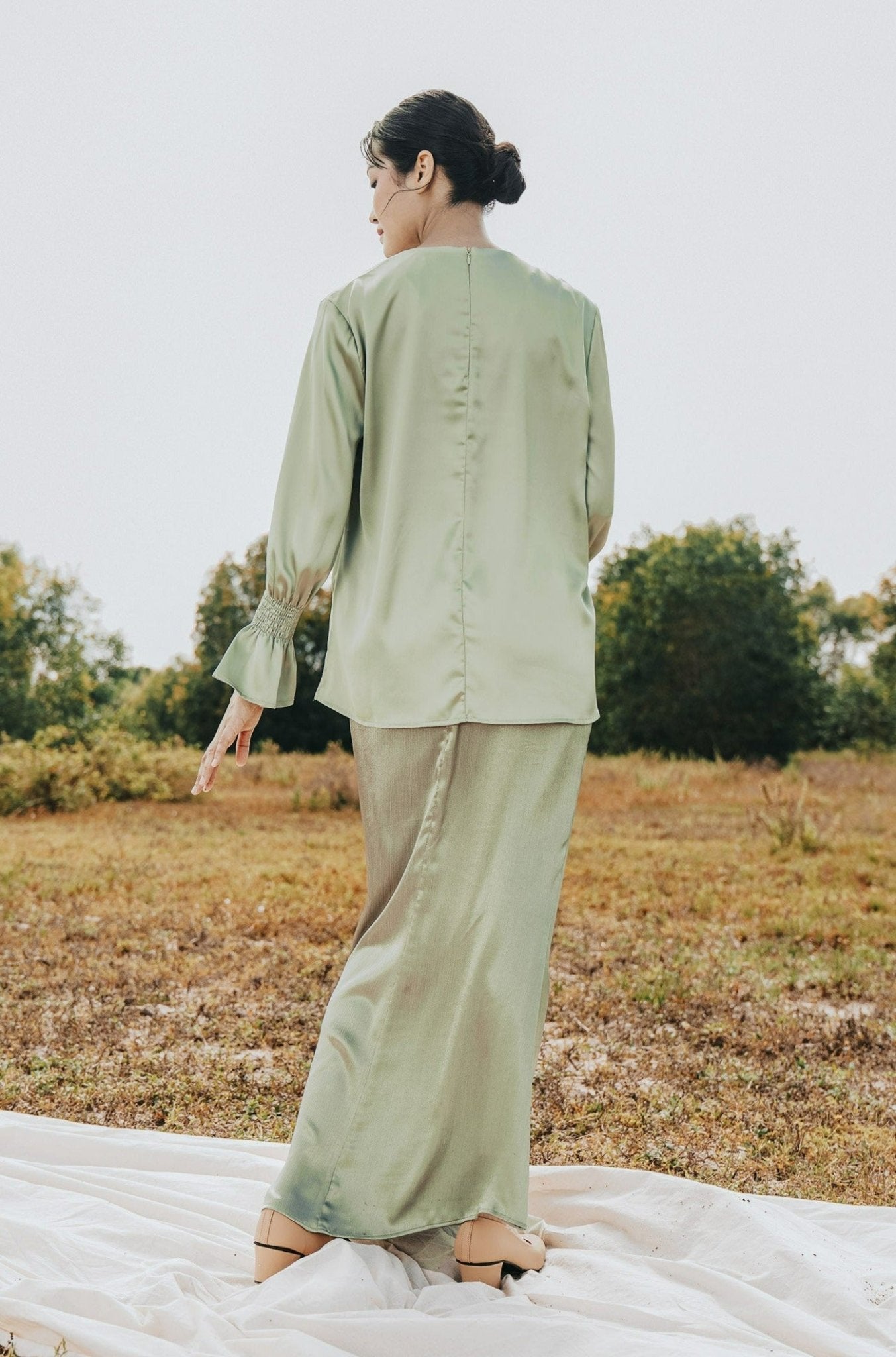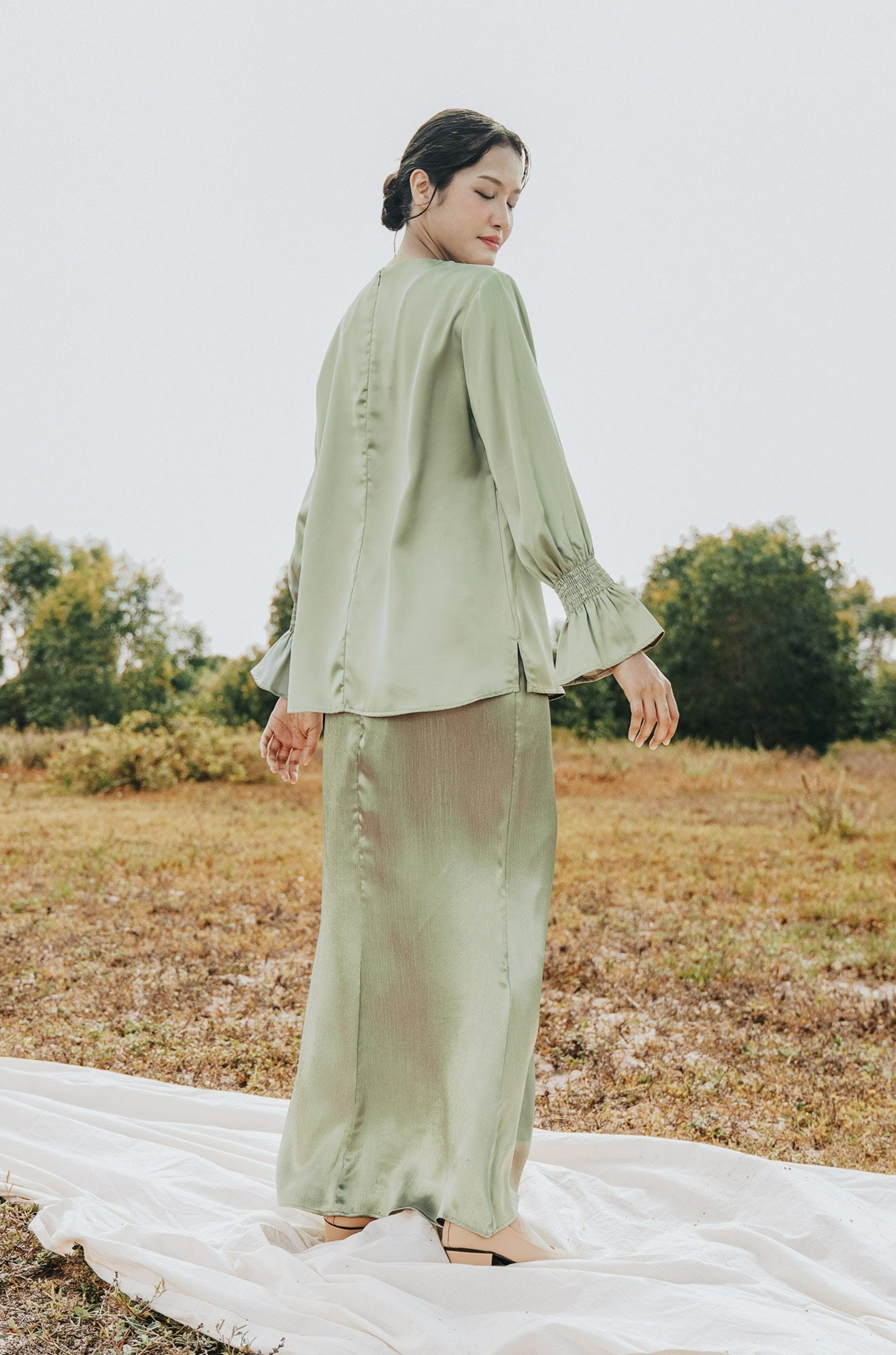 The Shawwal Collection Women Ruffle Sleeves Blouse Matcha Green Satin