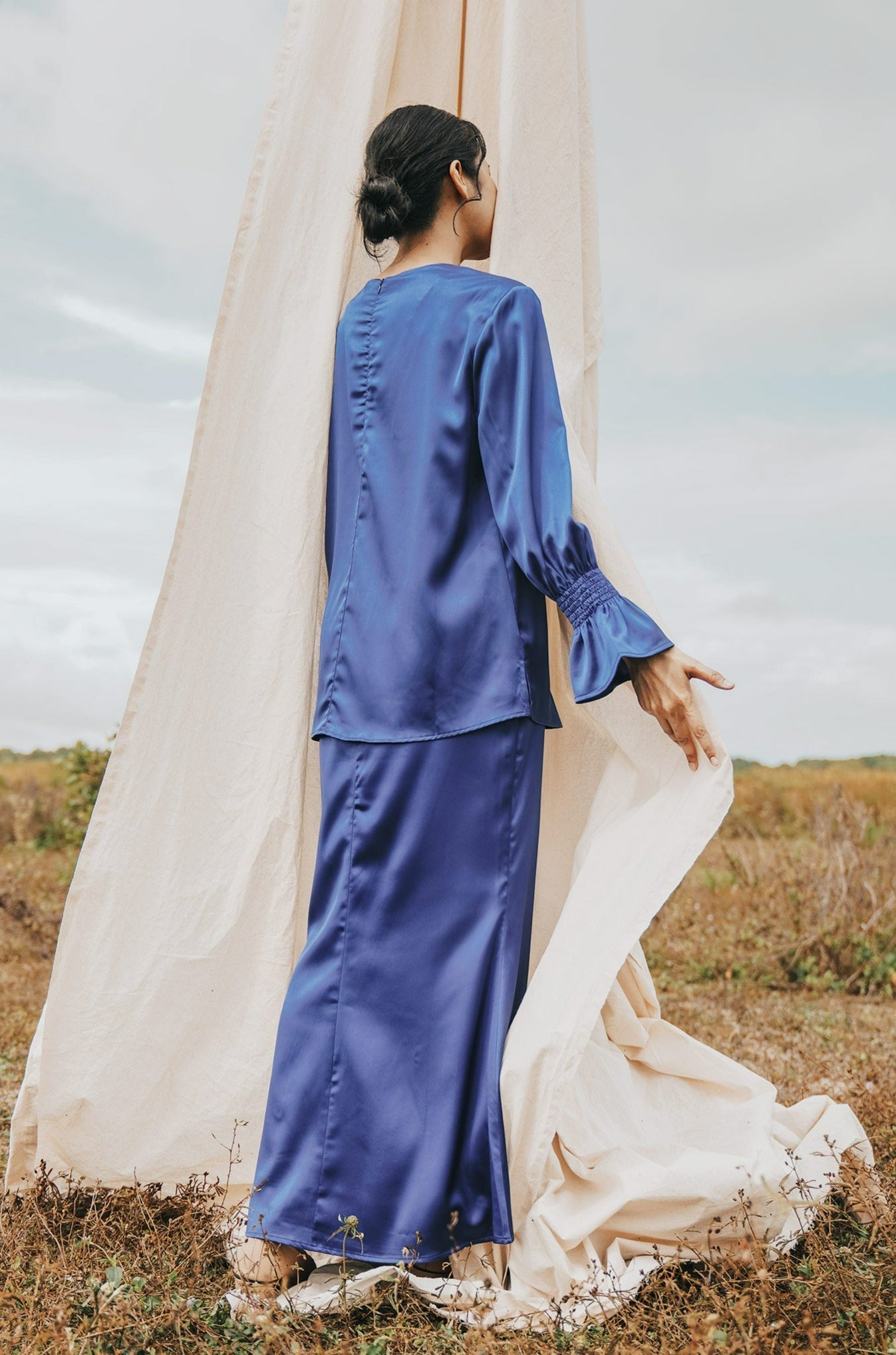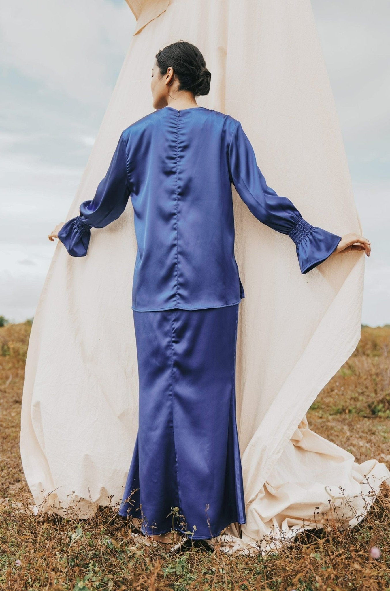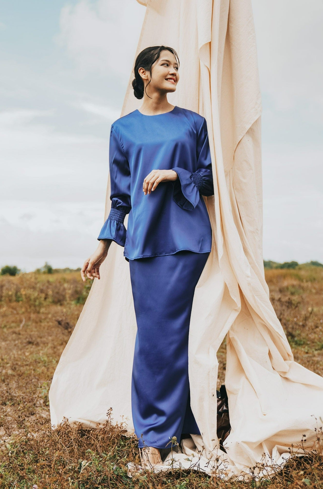 The Shawwal Collection Women Ruffle Sleeves Blouse Royal Blue Satin