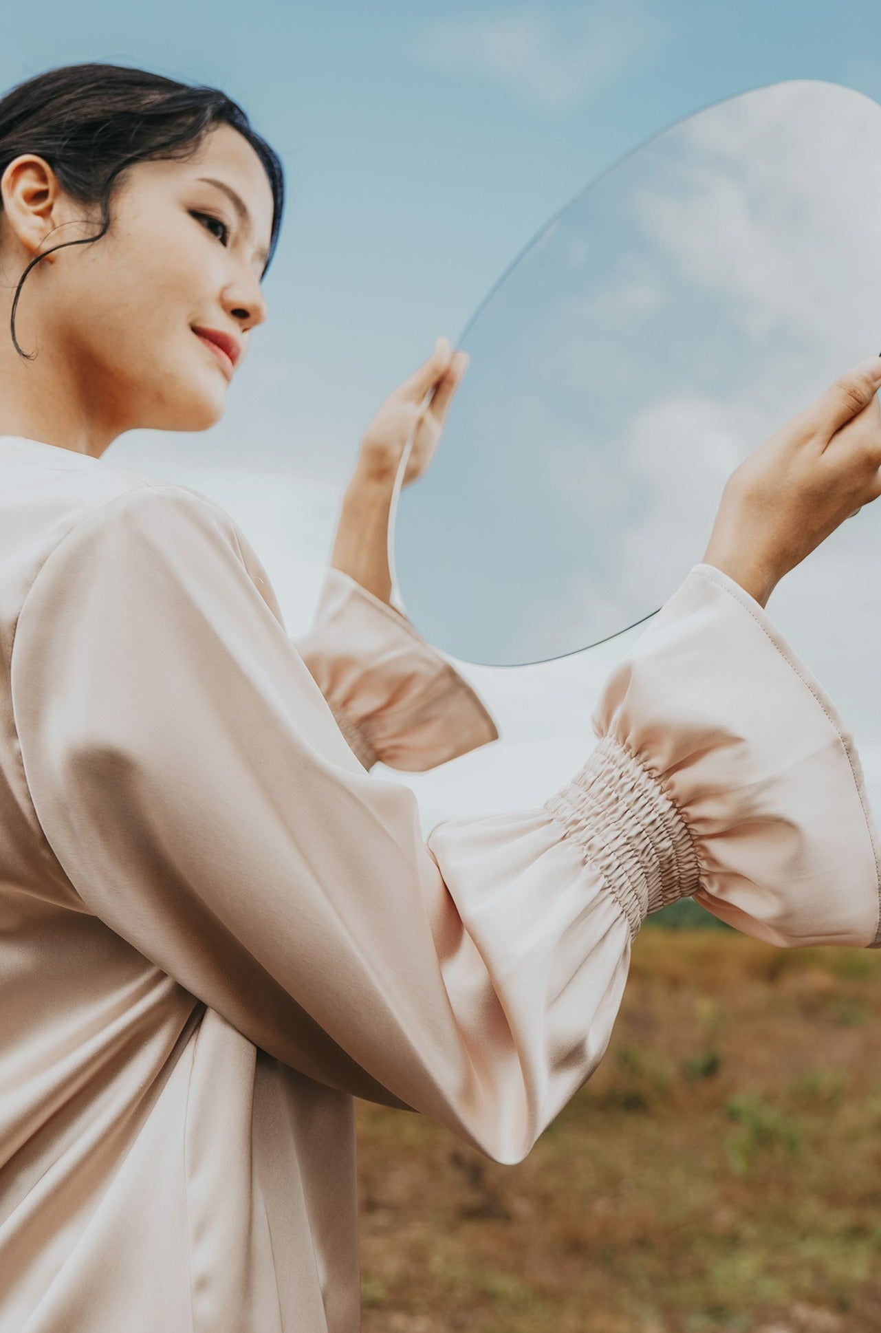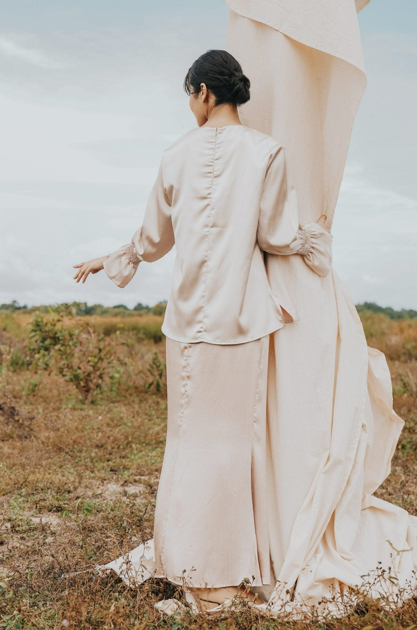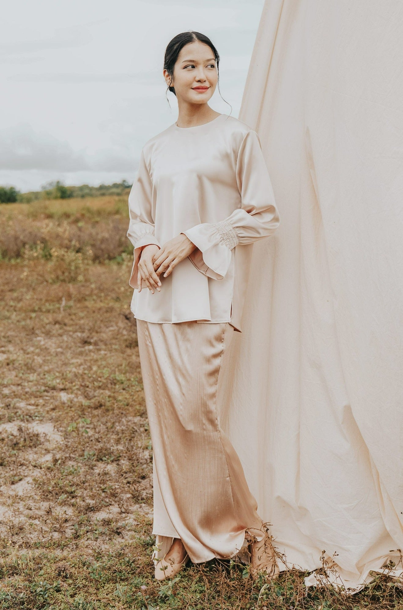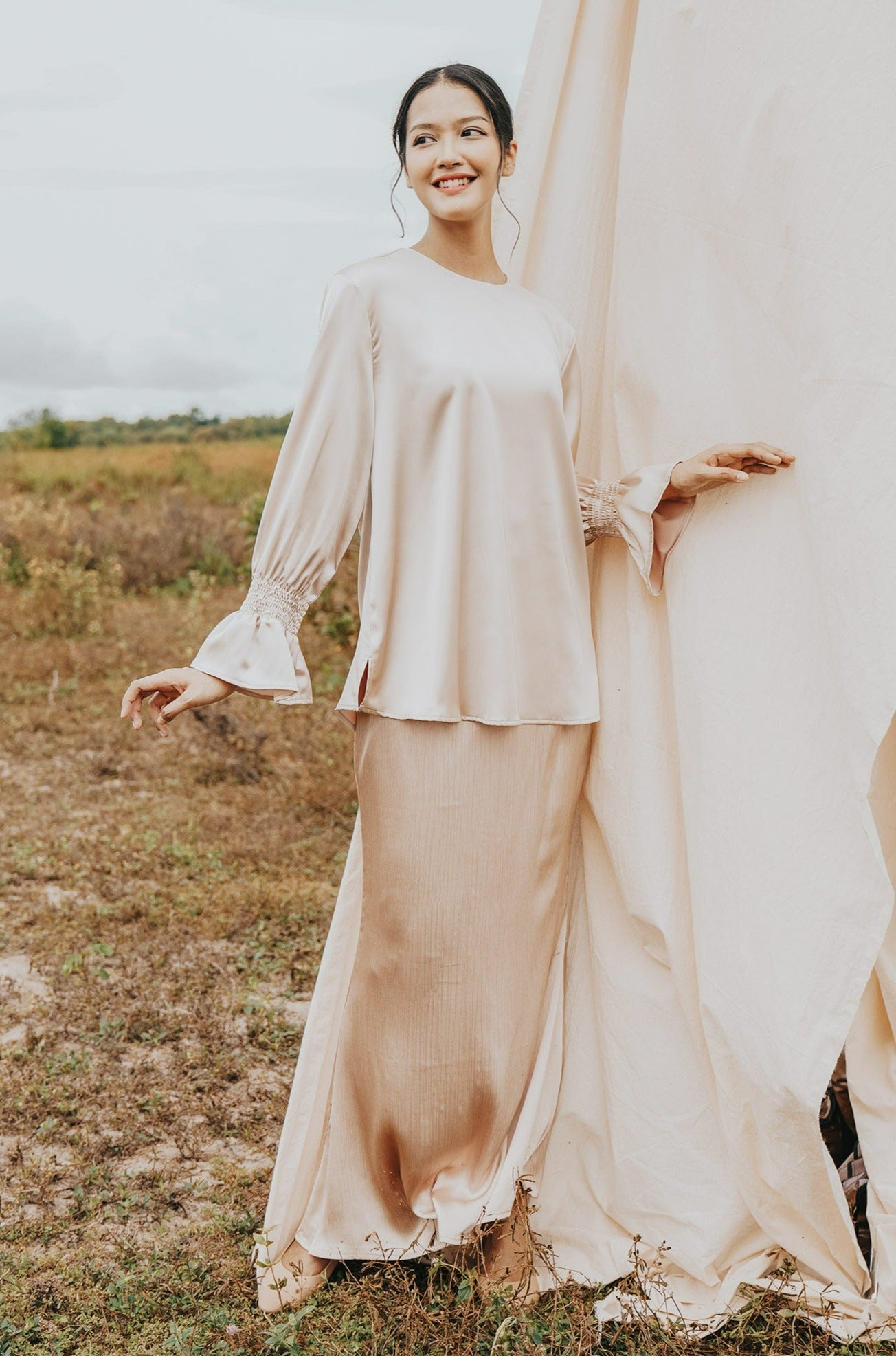 The Shawwal Collection Women Ruffle Sleeves Blouse Sand Satin