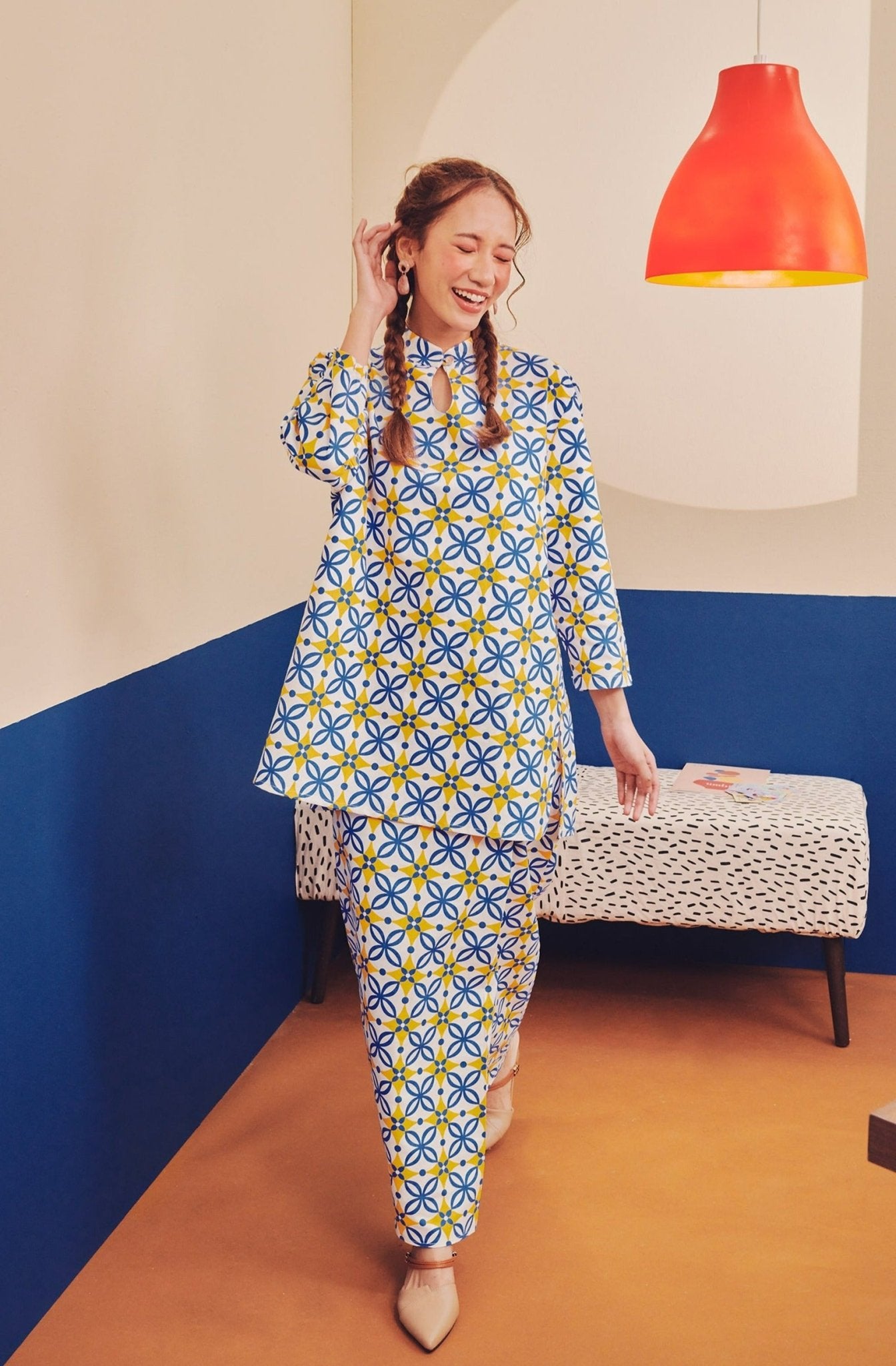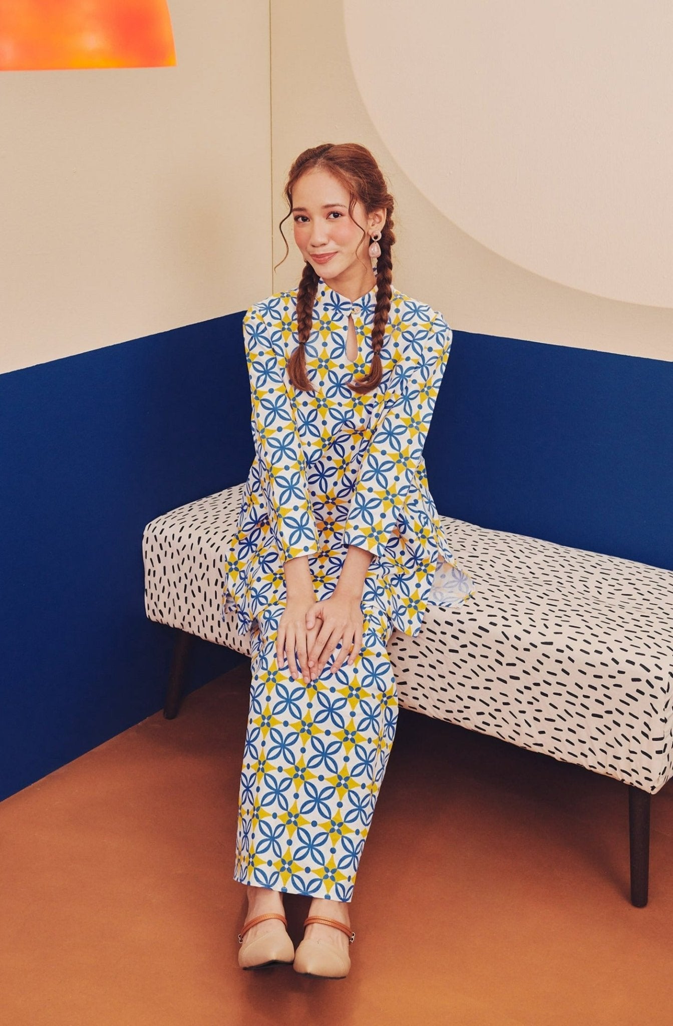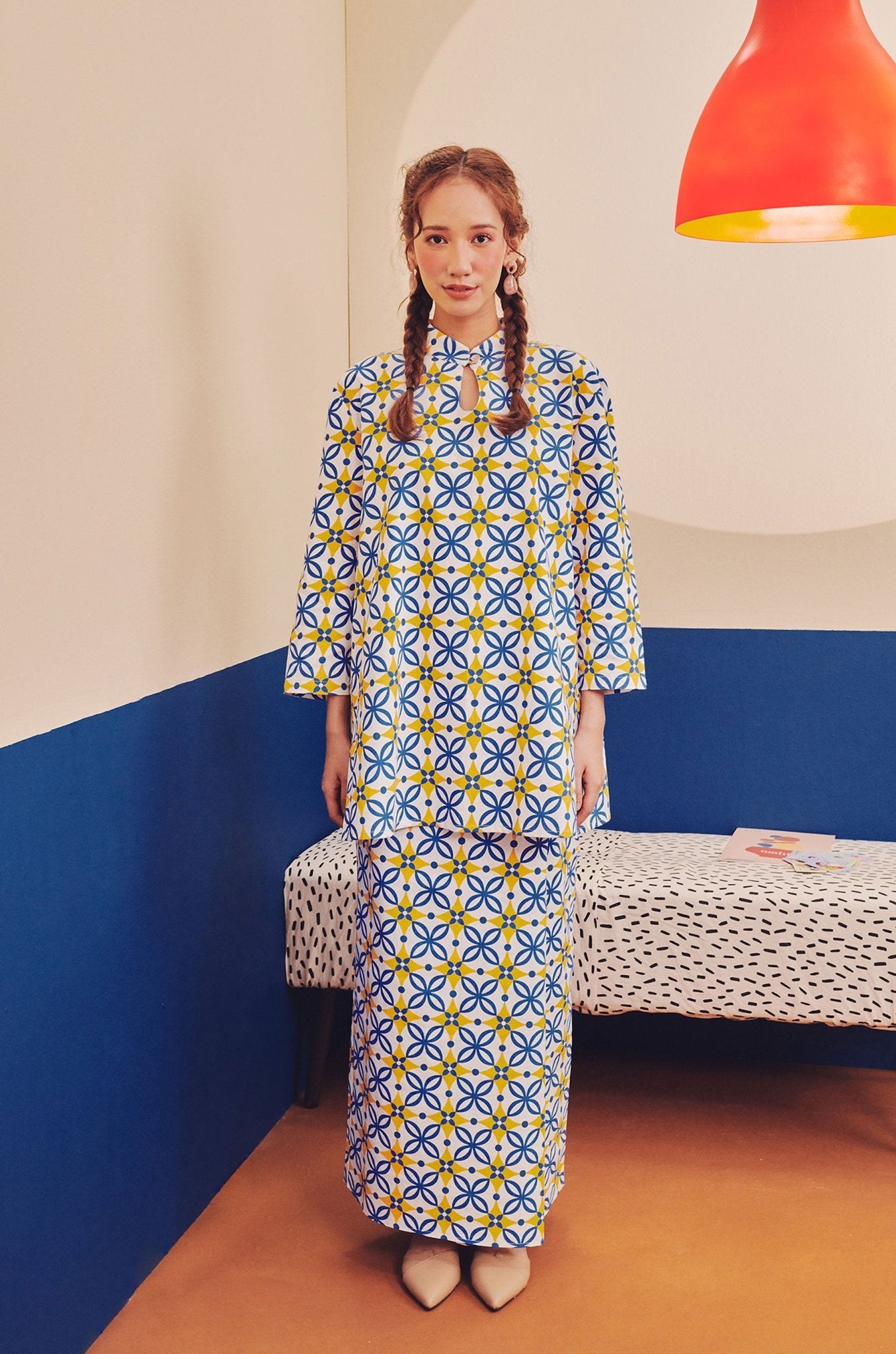 Women Mandarin Collar Kurung Blouse Popcorn Print