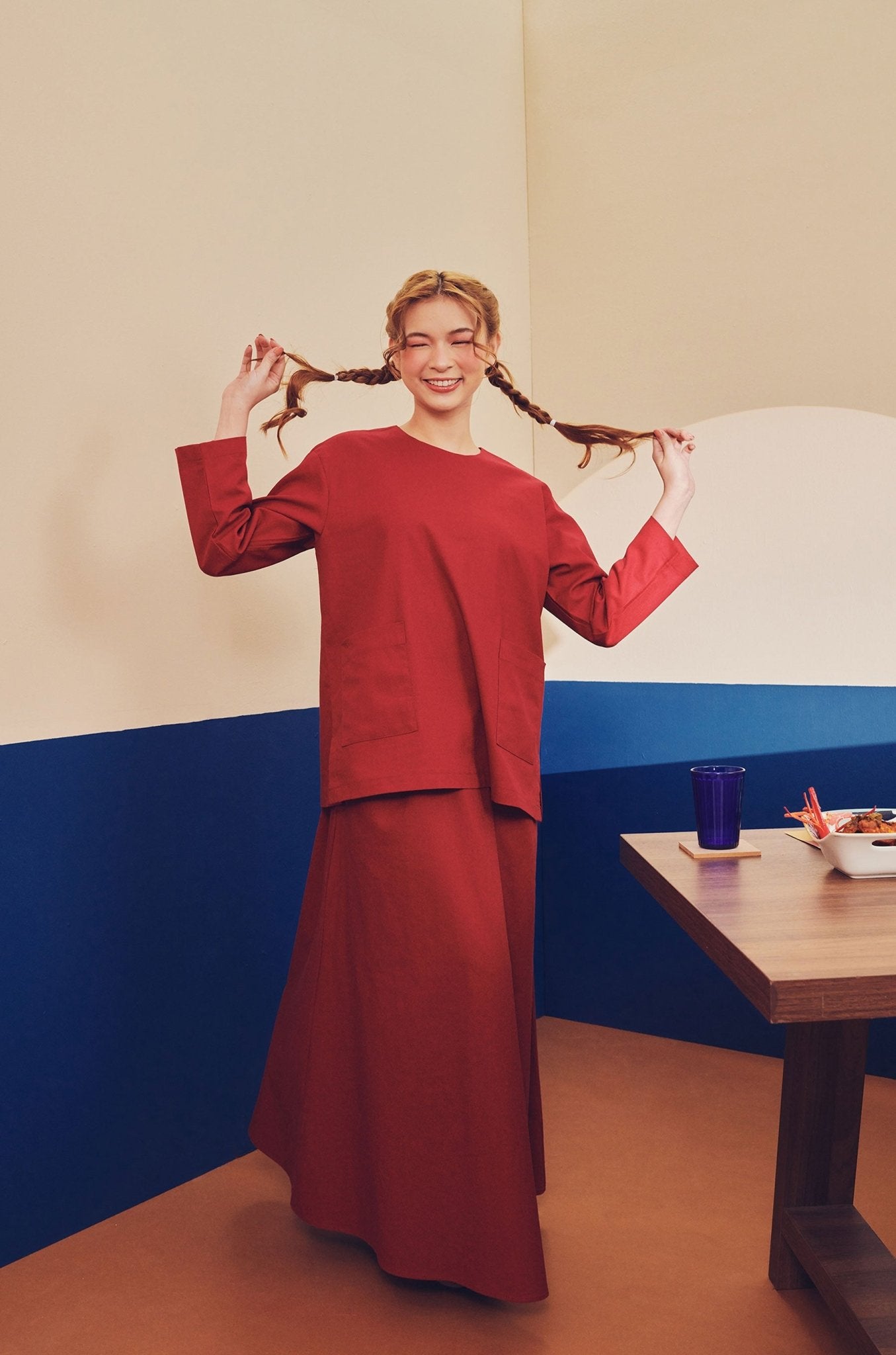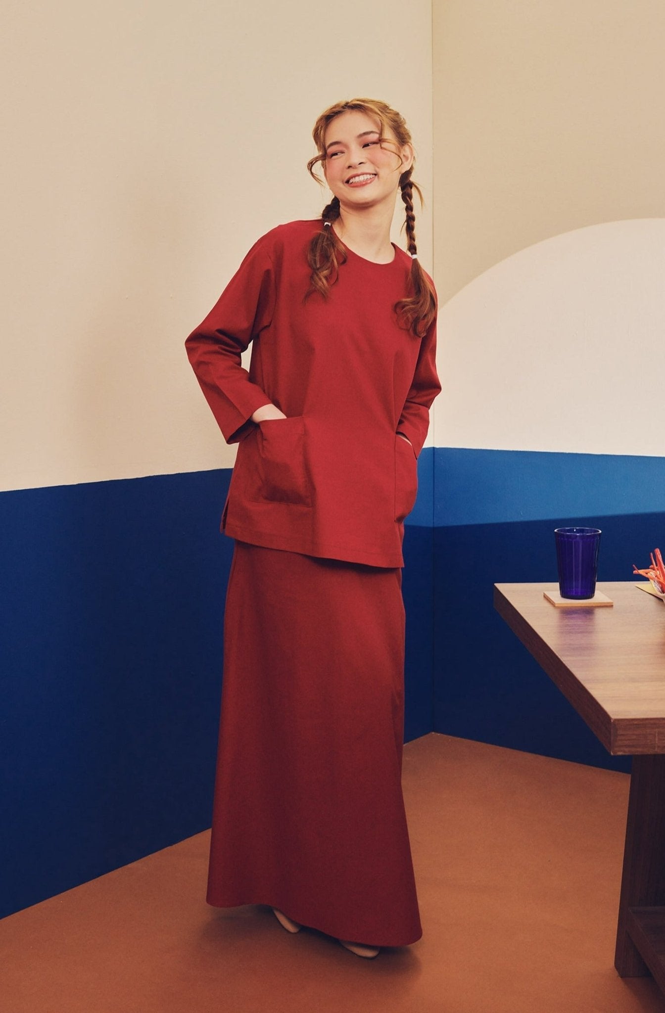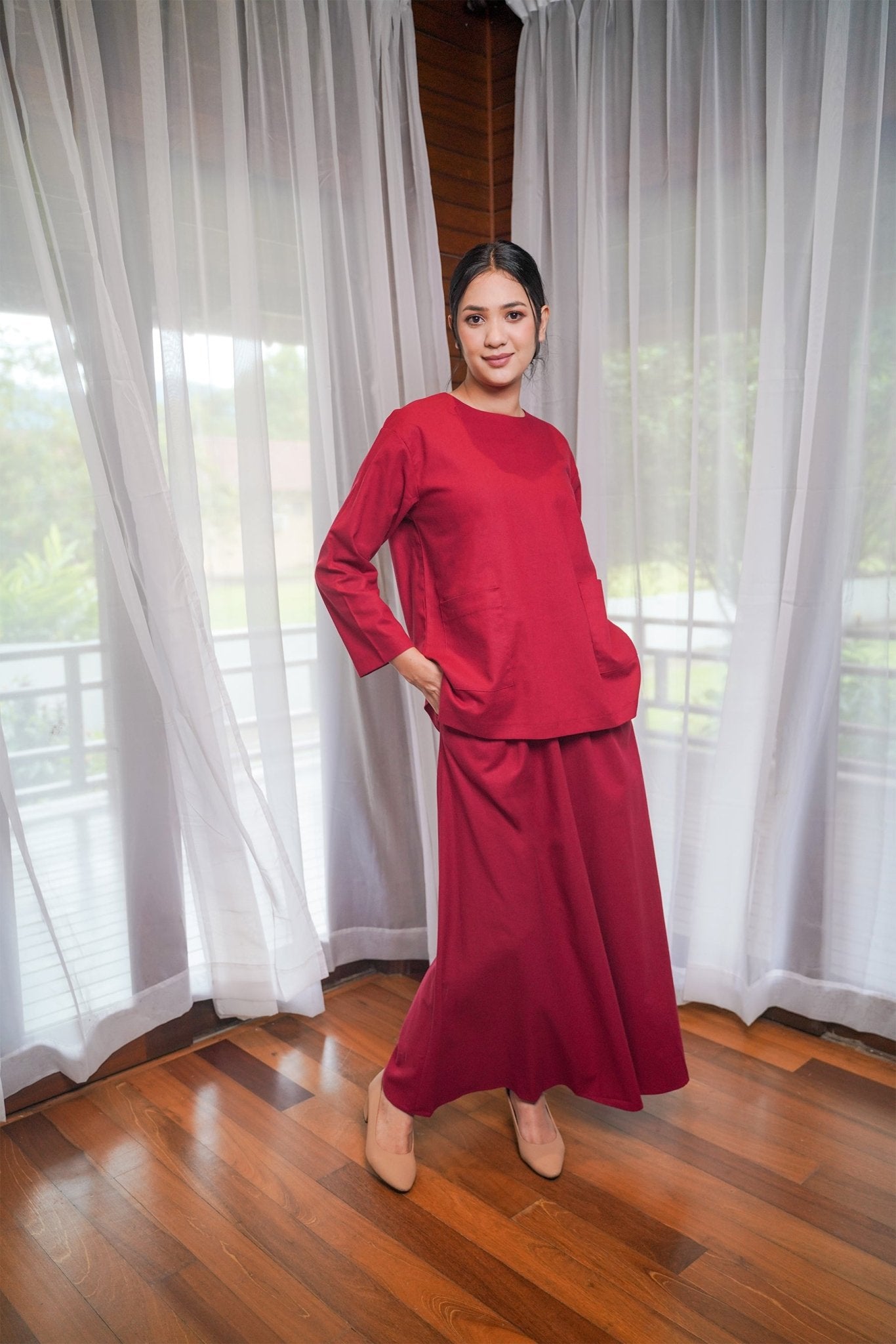 Women Pair Pockets Boxy Blouse Red